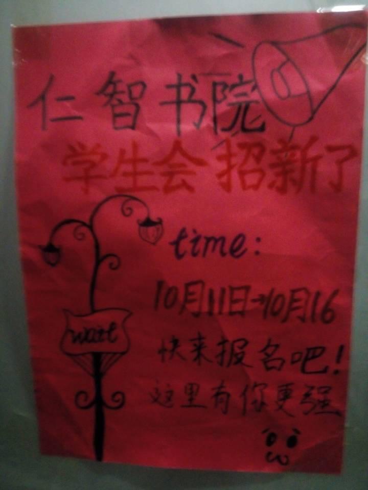 为了吸纳优秀人才,促进学生会更好的发展,给学生会增添新的、源源不断的活力2014年10月11日新乡医学院三全学院仁智书院学生会各部室在第一教学楼C201教室进行了招新。本次招新工作分为两个环节,首先以各大班为单位提交申请表,然后由学生会主席团以及各部部长担任评委进行第一轮面试和第二轮笔试。