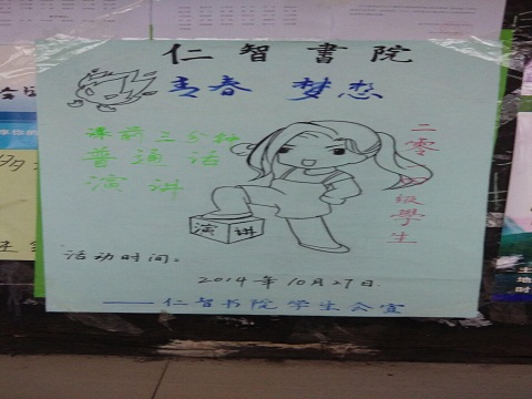 2014年10月27号,新乡医学院三全学院仁智书院针对2014级新生举办的“课前三分钟普通话演讲秀”将拉开序幕。此次活动是由仁智书院学生会主办,来丰富同学们的课余生活。
