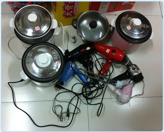 近日来很多学生反映宿舍断电问题,经查多为恶载断电。恶载断电对公寓电路系统危害是极大的。为了确保公寓用电安全规范学生用电。本次活动收缴了大量违规电器和其他违规用品,还发现了一些同学的不安全行为,及时处理,并给予批评教育。检查结束后违规同学自发的到生活老师值班室自我检讨,深刻的认识到了自己的错误。