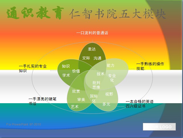 仁者爱人,智者知人。书院贯穿通识教育,融博学于精专于一体,传递科学与人文精神,培养学生健全完整人格,掌握学科交叉思维方式,提升独立思考创新能力,最终达到“自爱,为人爱,爱人”三种“仁”的境界。“自知,知人,使人知”三种“智”的境界。书院以“仁智五一工程”为载体,即“一口流利的普通话、一手漂亮的硬笔书法、一手扎实的专业知识、一本合格的英语四六级证、一手熟练的操作技能”。
