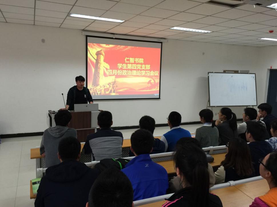 2015年4月16日,仁智书院第四党支部在第一教学楼C201教室召开以“弘扬和践行社会主义核心价值观”为主题的四月份政治理论学习会议。会议由支部组织委员岳万博同志主持召开。