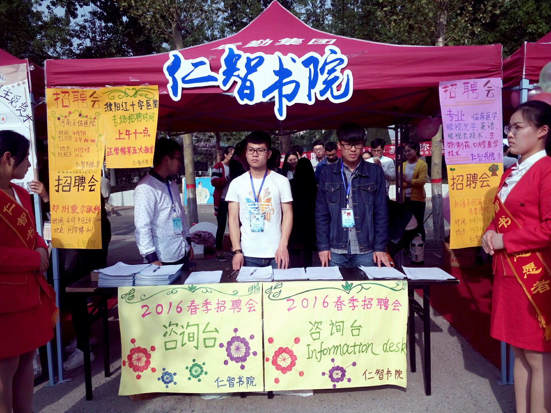 2016年4月9日,仁智书院参与承办的河南省大中专医疗卫生双选会拉开序幕。在此次招聘会上,我书院积极联系用人单位来我校招聘人才,除了圆满完成学校部署的就业招聘工作,在书院自主进行的专场招聘会项目上也交出了令人满意的答卷,4月9日当天,仁智书院共独立举办专场招聘会4场,与其他书院共同举办专场招聘会1场。