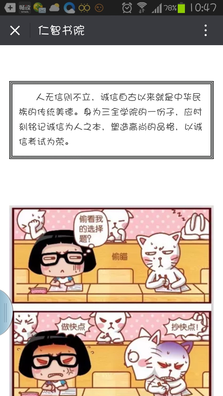 同时,我院也开展了以“诚信考试”的主题班会,从不同视角分析诚信考试的重要性,并且在书院长廊和书院微信上设立海报展和漫画展专题,过网络和现实,充分营造诚信考试氛围,全方面宣传“以德立身 明礼诚信”的重要性。