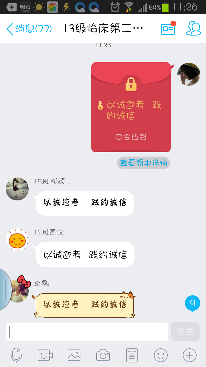 为了创新教育模式,利用现当今流行的网络通信平台,适应当代学生交流媒介,我院要求各位辅导员通过QQ群发放“以诚迎考 践约守信”口令红包的方式,用学生最易接受的方式,最接地气的手段,对学生进行诚信考试教育。同时以此为契机,针对考试焦虑症状,作了相关的解读和心理辅导,帮助同学们掌握正确的考前心理调适技巧,学生参与度高,反映良好。