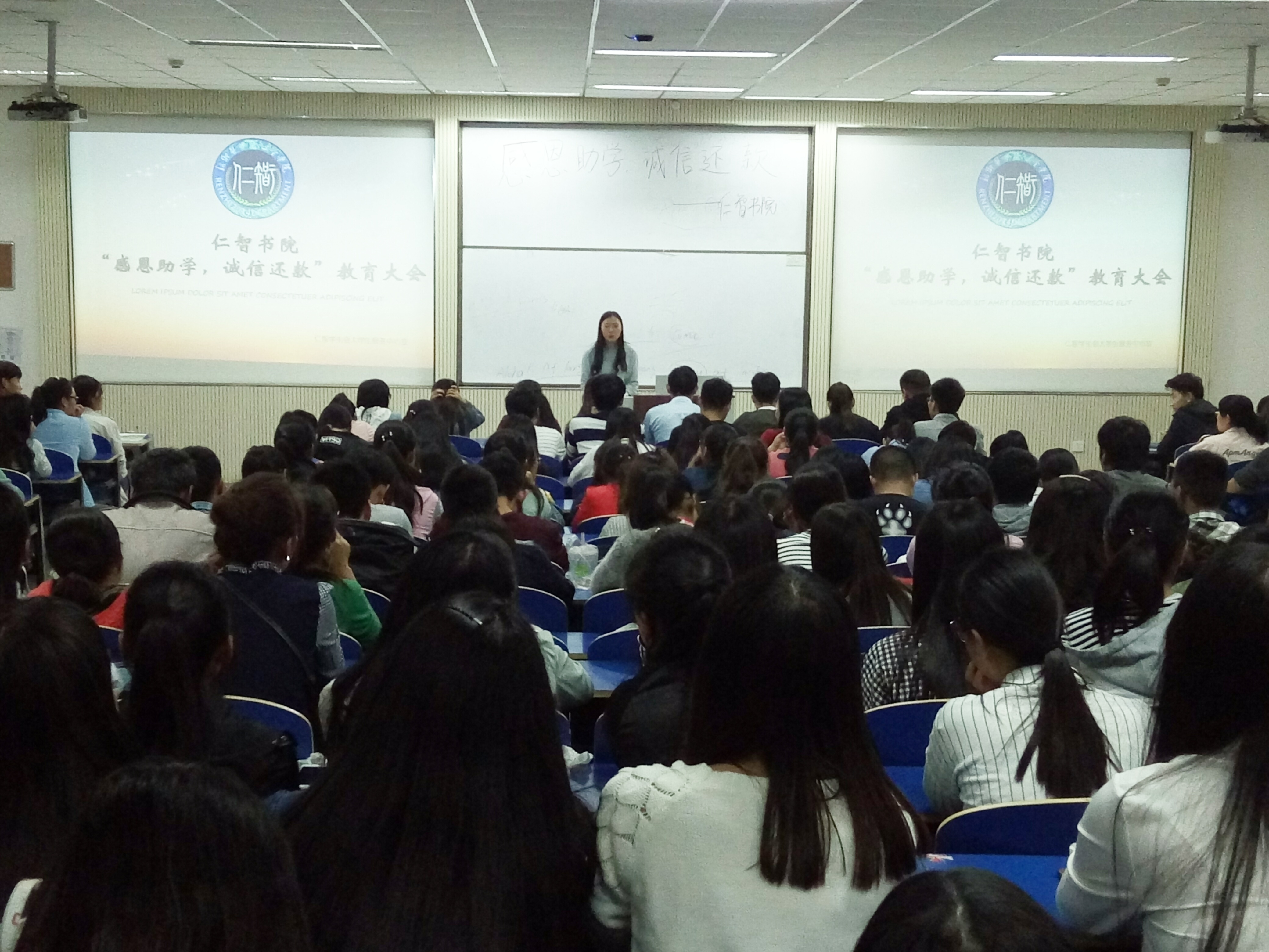 2016年10月17日,新乡医学院三全学院仁智书院在第一教学楼A302举办了感恩助学,诚信还款教育大会,下午六时整,会议正式开始。