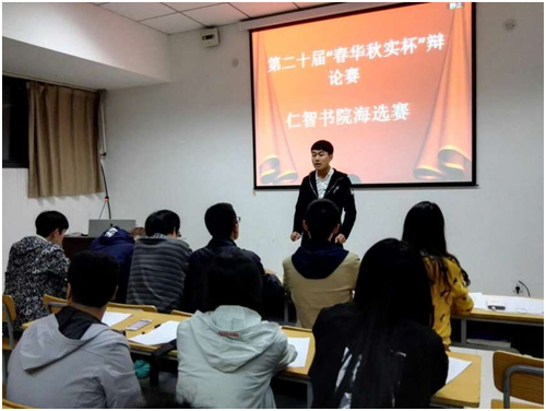 首先由主持人上台说明比赛的规则以及评分规则。接下来由选手们依次上台进行自我介绍,展现自己的语言表达技巧,并对一个辩题进行辩论。选手们侃侃而谈,旁征博引;场下观众激情澎湃、掌声连连响起,最终为仁智书院选拔出七名优秀选手。本次辩论赛海选在同学们热烈的掌声中圆满地落下帷幕。