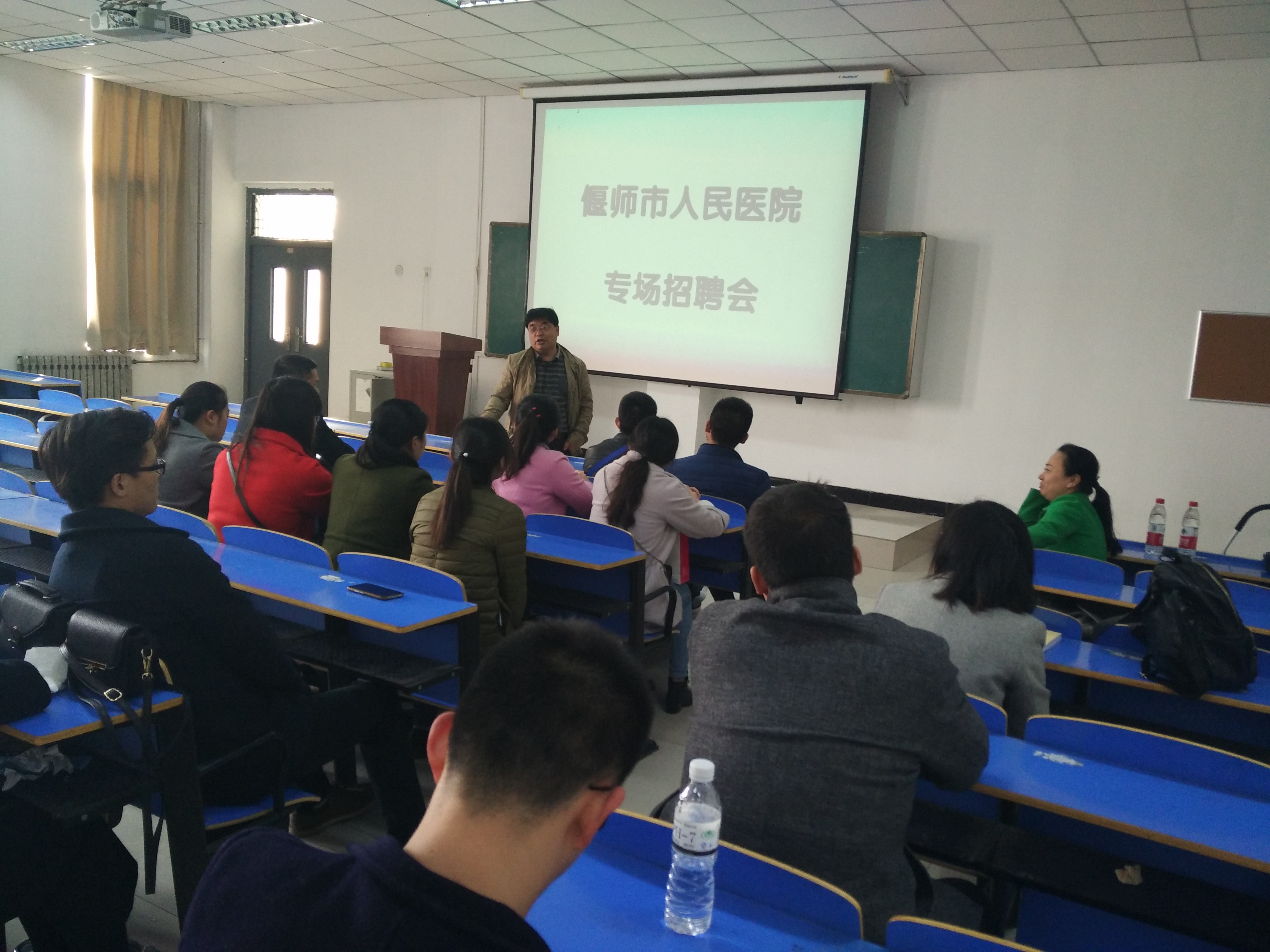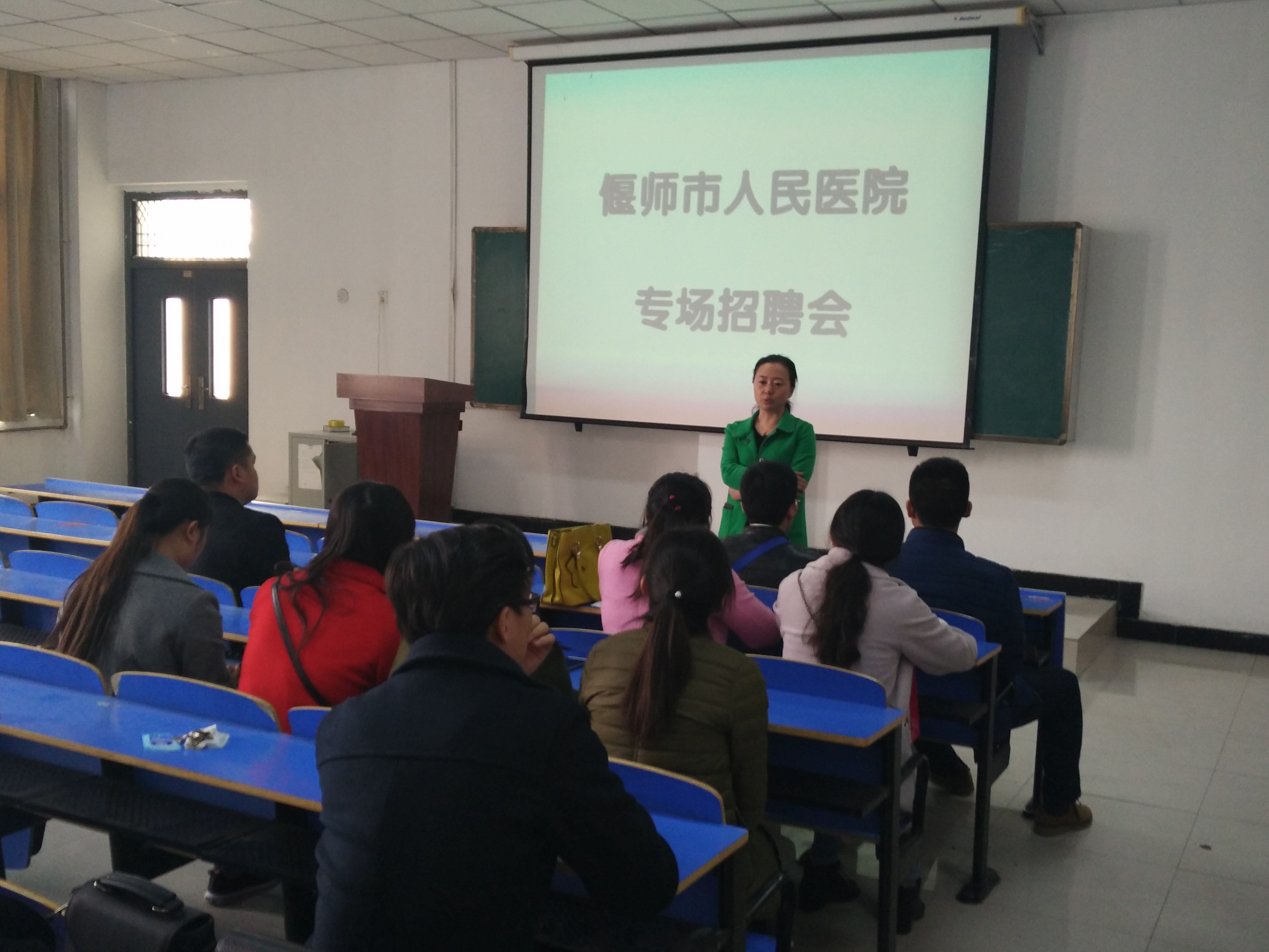 招聘会共两个小时,地点在新乡医学院三全学院新乡校区问学楼303教室,参加招聘会的有学生事务发展部赵云娟老师,偃师市人民医院赵院长、人事科的王科长、医教科的李科长和王老师,以及我校2017届的毕业生。首先公司负责人以ppt的形式向在场毕业生介绍公司的背景以及招聘专业和人数,招聘主要面向医学专业相关的岗位,及其公司所急要的专业人才。不少同学都对本次招聘充满极大的兴趣,希望成为一名医疗工作者为人们解决身体健康问题,为人类的健康奉献终身!最后,用人单位收取了现场同学的个人简历,并逐个进行了简单的面试。同学们对本场招聘会充满自信,对到场的偃师市人民医院也充满希望。
