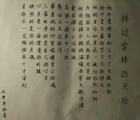 本次硬笔书法大赛以弘扬雷锋精神为主题,鼓励同学们学雷锋、做雷锋。活动中,同学们积极参与,交上来一幅幅精彩绝伦的作品。由学生会成员组成的评选小组对作品进行了第一轮筛选,最后胜出的优秀作品于微信上发起投票。此次硬笔书法大赛书法展为枯燥的学习生活增添了不少活力。