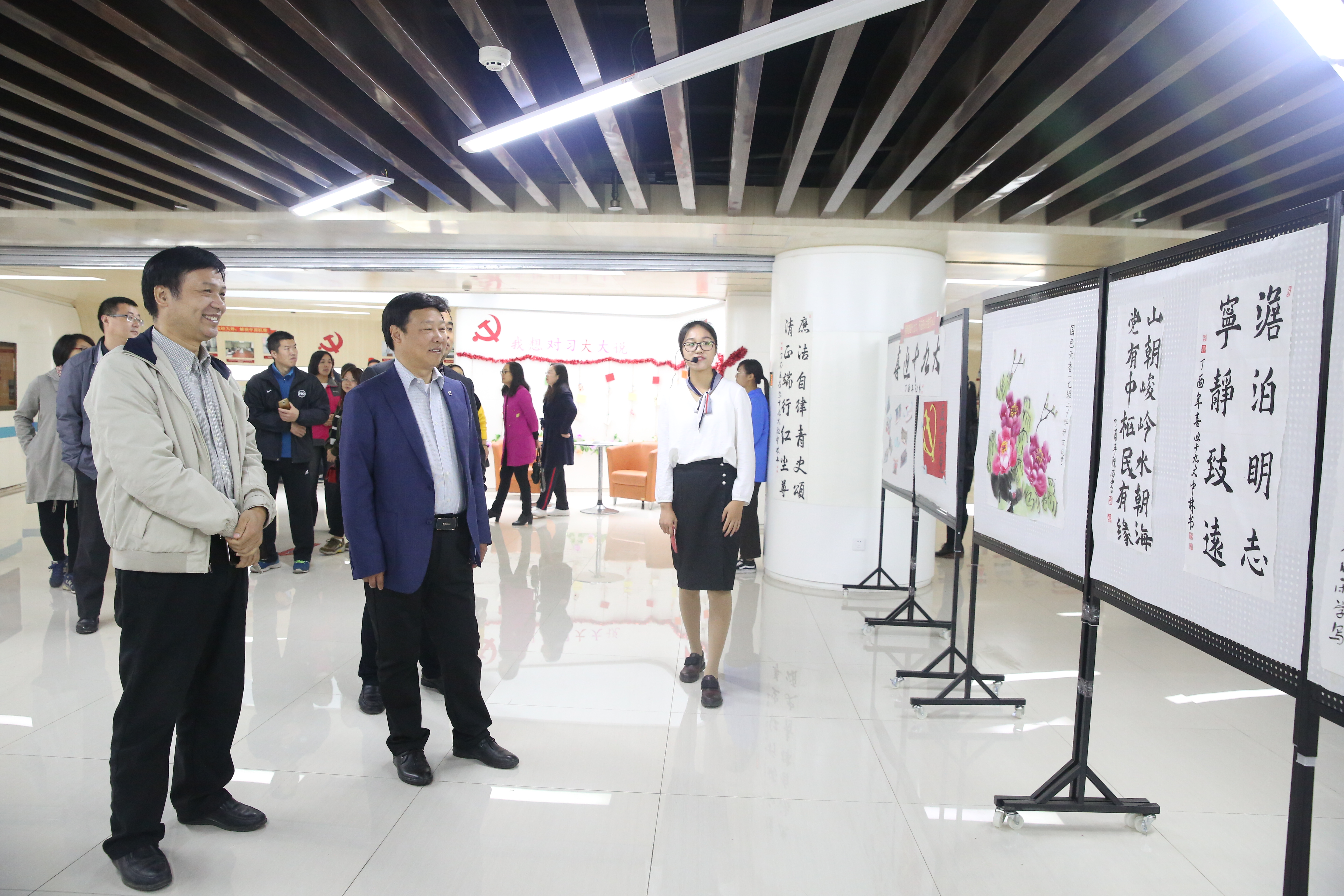 “棒棒哒,我的全世界”展区分为党建活动展及学生作品展。党建活动展介绍了自十八大以来,我院规范基层党组织设置,加强规范化制度化建设,强化党员教育与管理,创造性地开展各项党建主题教育活动,党的群众路线教育实践活动、“三严三实”专题教育、“两学一做”学习教育活动的开展,体现了我院紧跟党的步伐,不断完善而努力奋斗的态度与决心。学生作品展区以“用青春迎十九大,不忘初心为党打call”为名,征集了全院学生书法、绘画、剪纸等优秀作品,栩栩如生的绘画,生动形象的剪纸,令师生们点头称赞。