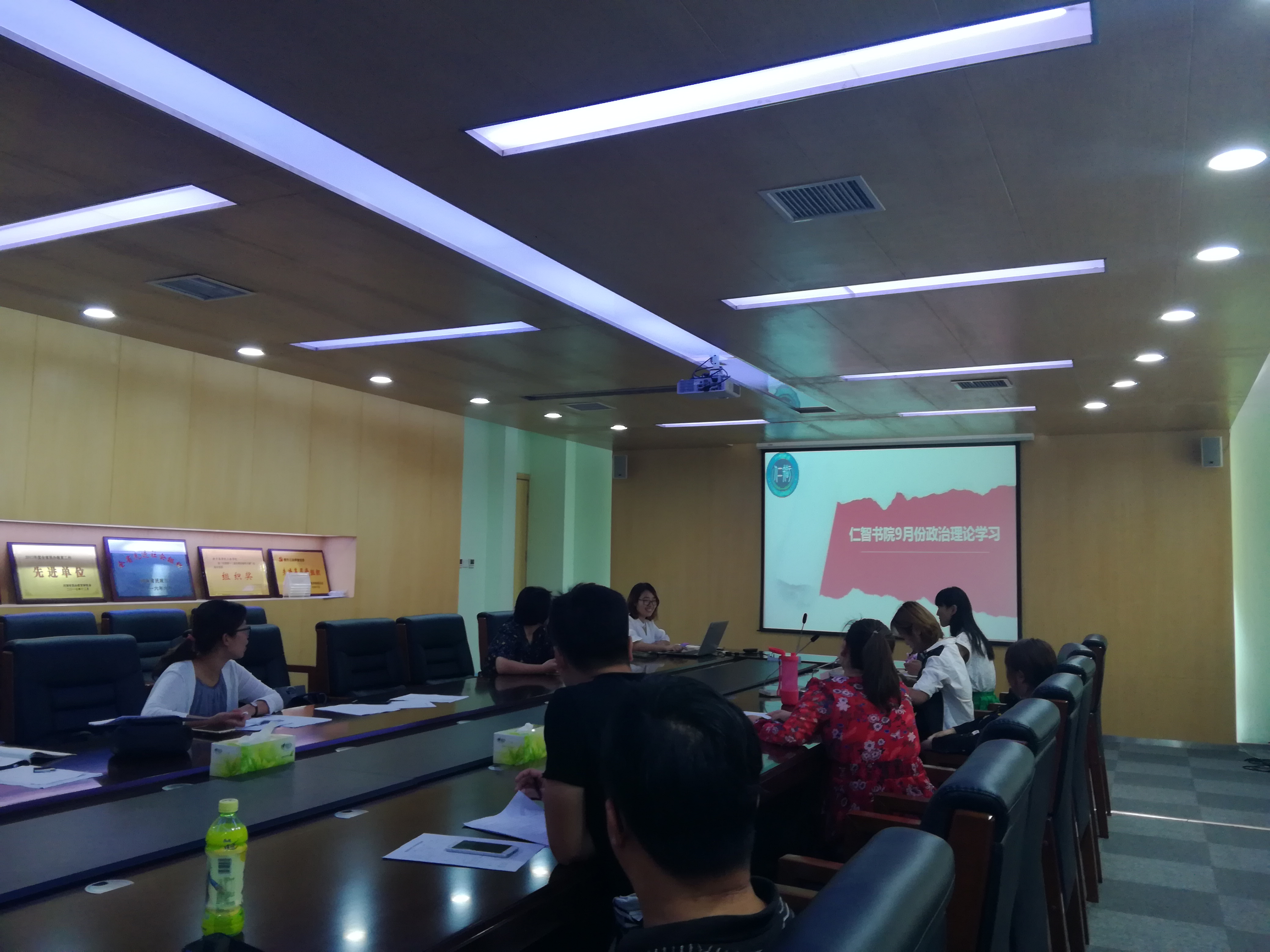 2018年9月11日下午,仁智书院党总支全体党员在行政楼第三会议室组织进行9月份政治理论学习。召开以“教师节主题党日活动” 为主题的政治理论学习会议。会议由党总支副书记班锦同志主持。