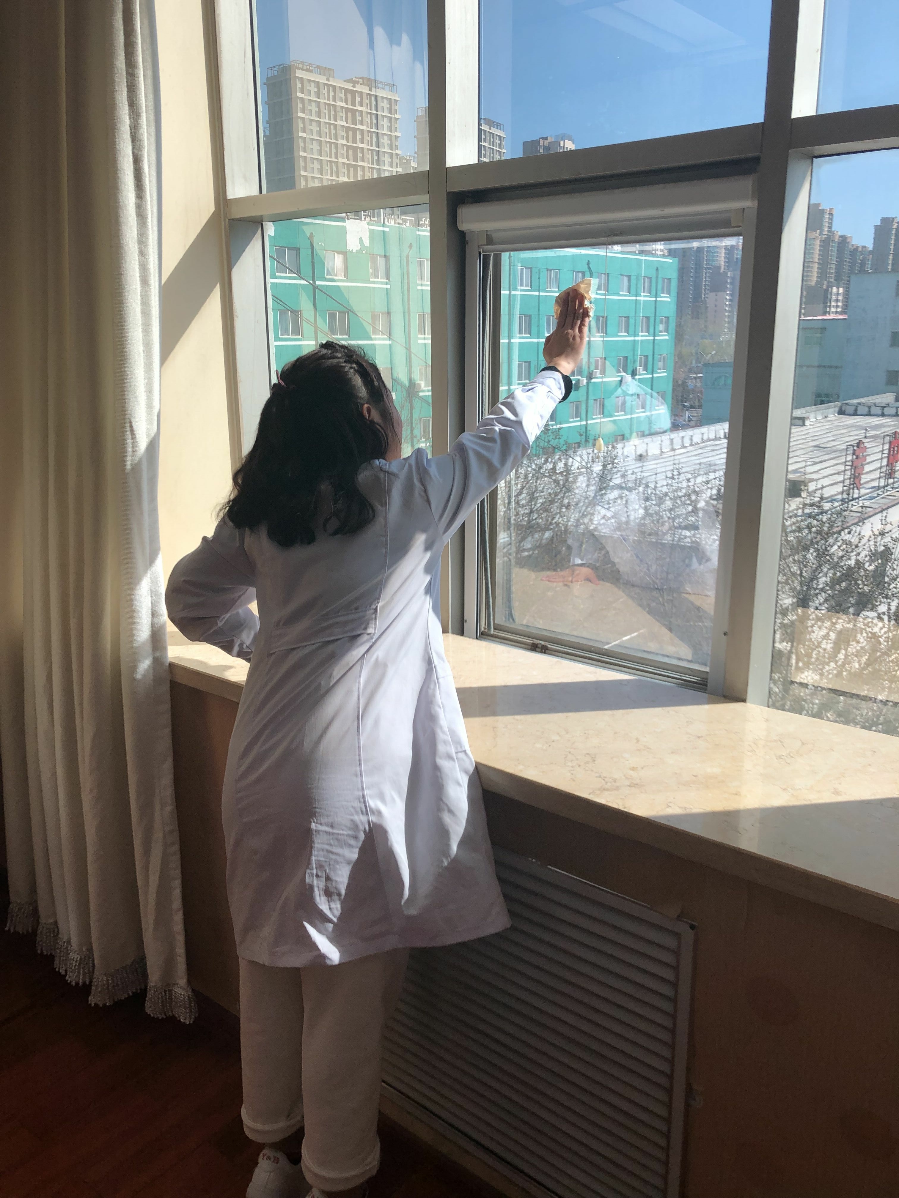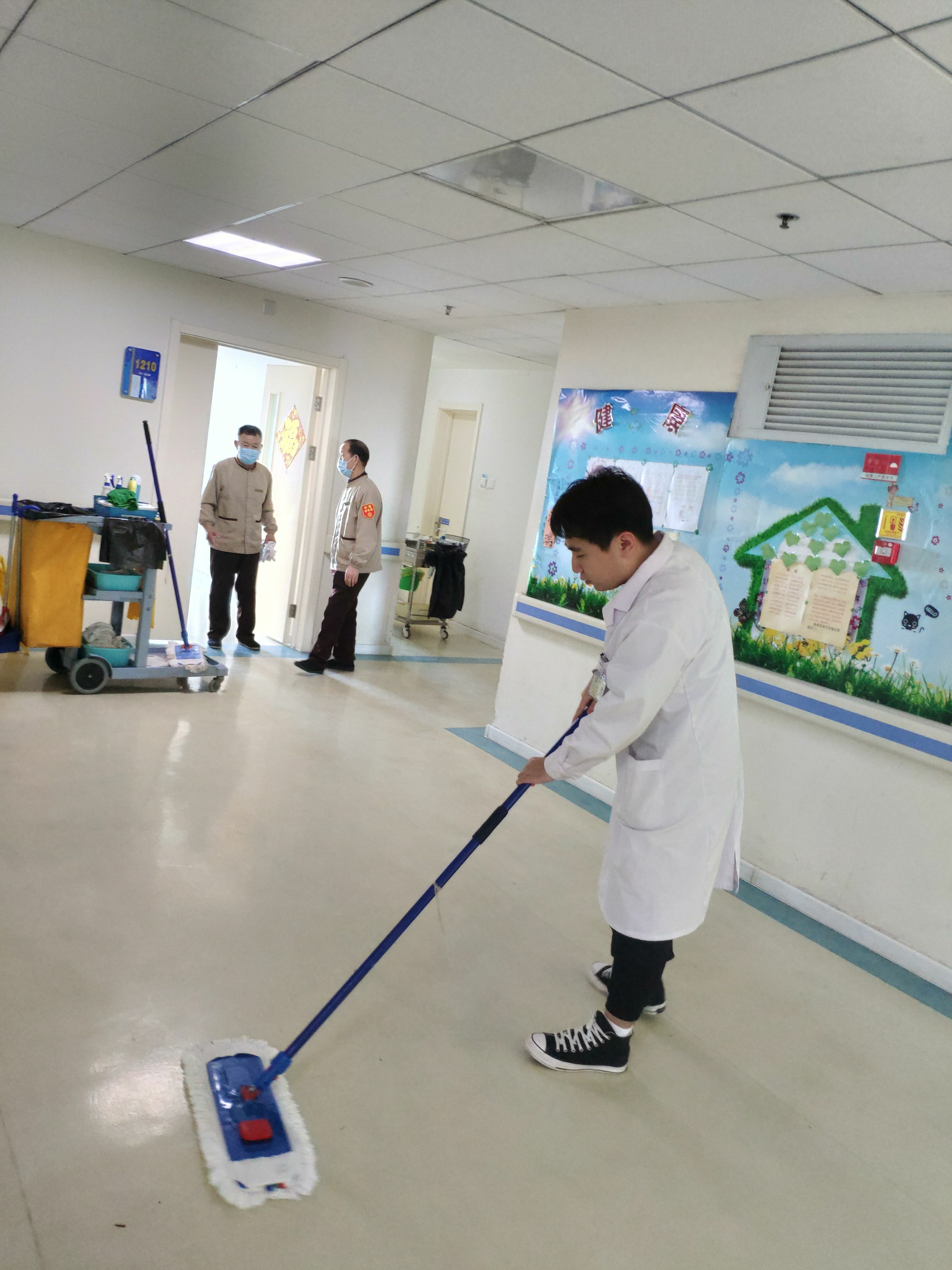 中美医院的见习生有三个班,他们自发的安排轮班,对自己上课的教室,以及见习轮转的科室进行打扫卫生工作。每天中午科室见习结束后,同学们会主动到楼层的卫生器具放置处,拿簸箕和拖把,把科室的地面打扫的干干净净。同时,还有同学在科室医生的指导下,主动对病人进行简单的护理和治疗。