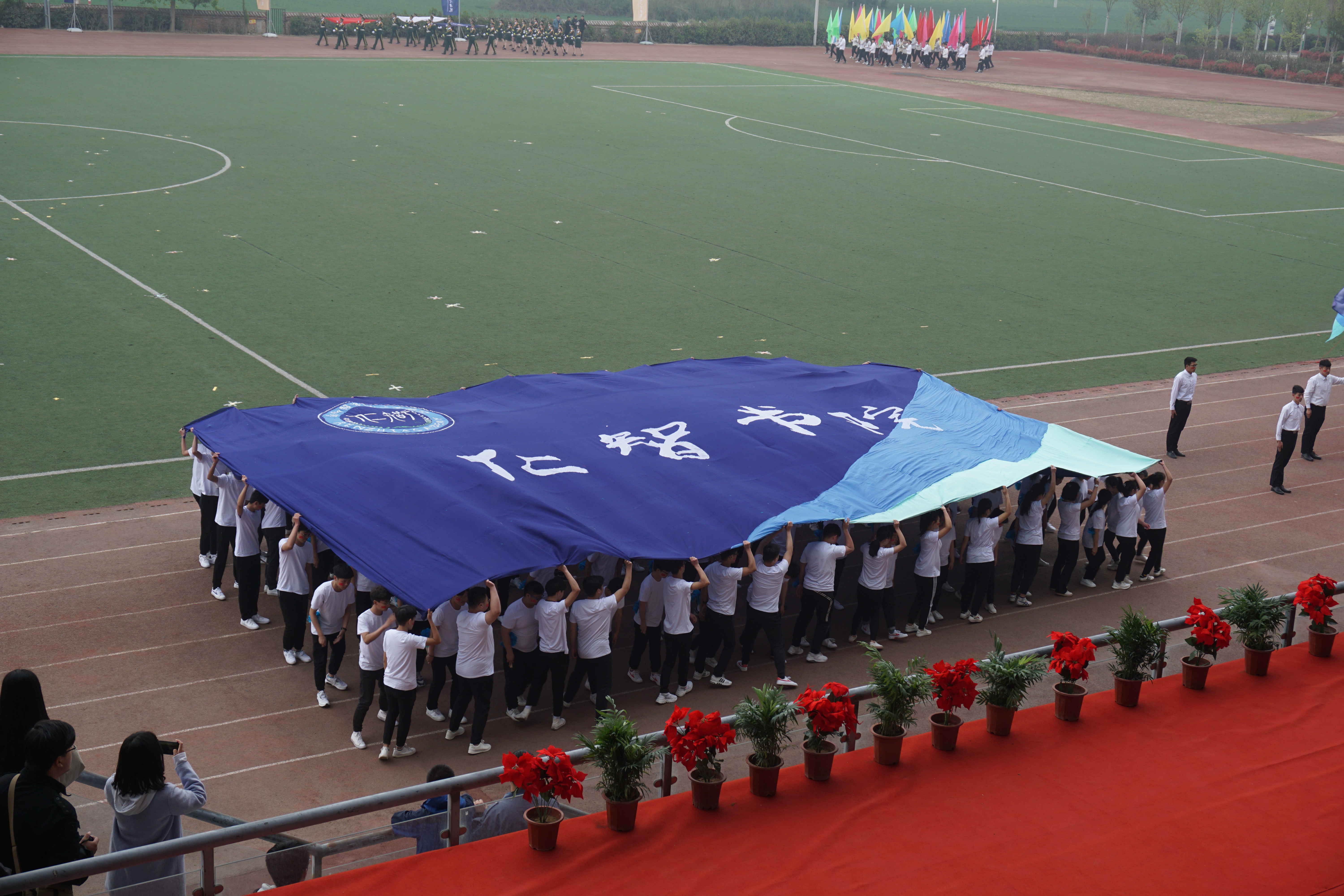 在运动会开幕式上,五星红旗乘着庄严的国歌冉冉升起。紧接着,仁智书院方阵队踏着坚定的步伐走进风雨操场,整齐的队伍,默契的配合和灵活的队形变换都展现出仁智学子精勤不倦诚爱仁朴的精神风貌,在团体操表演中,四百多名仁智学子伴随着动听的音乐和优美的旋律为祖国献舞,庆贺建国七十周年,展现中华追梦人的英姿,同学们熟练地变换着“风车”“1949”“2019”“庆”“七十”等队形,当仁智学子在操场中央摆出红心包围着“中国”的字形时,观众席上响起阵阵掌声,所有人一起大喊“我爱你,中国”!时隔两年,仁智书院团体操表演再次荣获冠军!