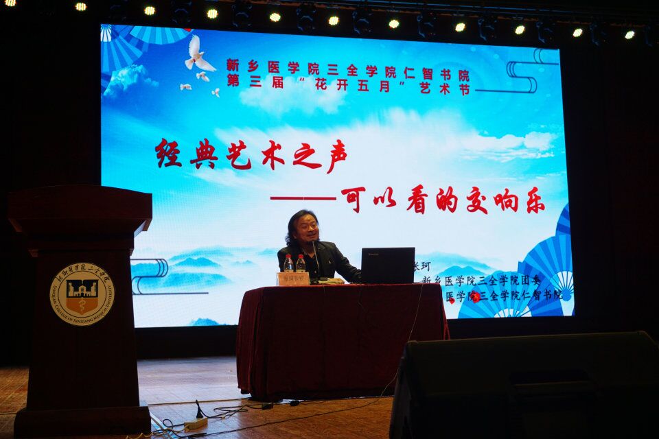 艺术具有净化功能,可以陶冶人的情操,匡正人的品性。基于对“艺术美育”功能的认识,我院举办“花开五月”艺术体验月活动。2019年5月13日14:30在闻德礼堂举办了“经典音乐之声之可以看的交响乐”艺术讲堂,本次活动邀请了留意青年男高音歌唱家,河南省音乐家协会会员,河南师范大学帕瓦罗蒂音乐艺术中心副主任张珂副教授。他用短短两个小时,带我们走进了音乐的世界,走向了交响乐的殿堂,从《幻想2000》这部由华特·迪士尼所创作的电影开始,一步步引人入胜的讲解交响乐,其中着重提了贝多芬的命运交响曲,对应动画则是鲸鱼父母带着鲸鱼宝宝成长历程。