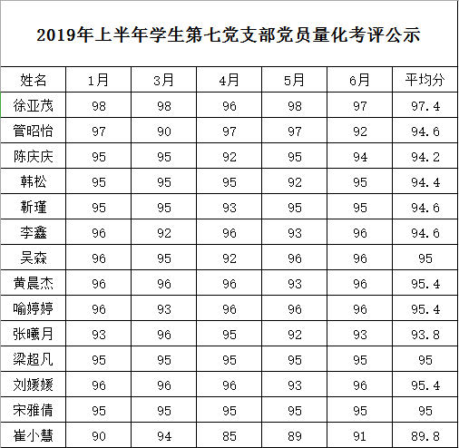 2019年学生第七党支部上半年党员日常量化考评公示