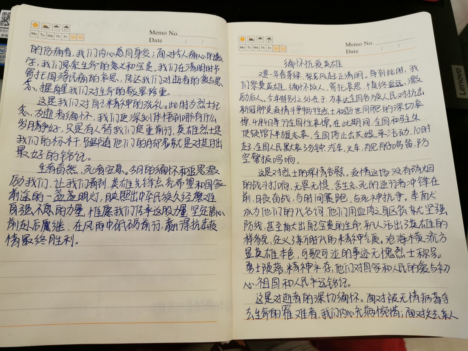 此次活动主要围绕“献一束祭奠之花,送一句感谢之语,写一篇感想之话。” 为主要形式,号召全体师生利用手机、电脑等方式登录中华英烈网、“致敬·2020清明祭英烈”等专题版块,为英烈们敬献黄菊,深切缅怀已故英烈,继承英烈遗志和弘扬英烈精神,同时,在网站上还可以看到烈士名录和生前事迹在“英雄赞歌”的栏目中,从70多年前的抗日战争到今天的抗“疫”战争,每个英雄的故事读来都荡气回肠,令人肃然起敬。此外,全体师生还观看了关于新冠肺炎疫情牺牲烈士的哀悼直播活动,对在抗击新冠肺炎疫情中牺牲的烈士表示哀悼之心、崇敬之情和传承之志,之后,多名学生自发在朋友圈等网络平台发布个人感想,表示云端缅怀先烈,遥寄哀思念英雄。