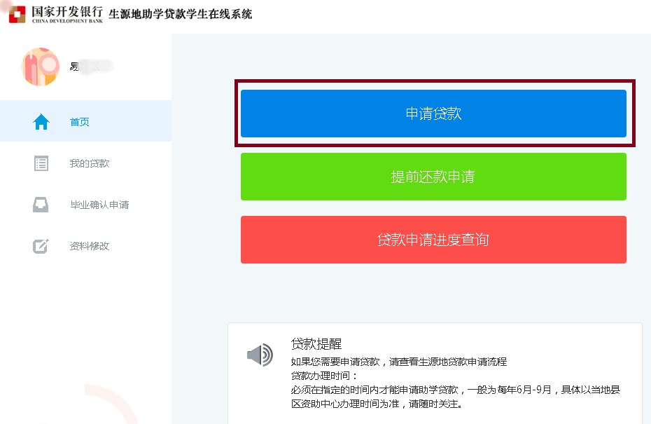 4、续贷学生点击“申请贷款”,开始续贷申请操作
