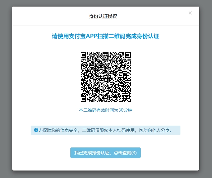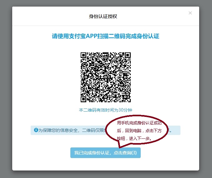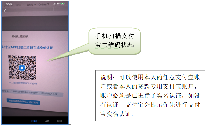 注:使用支付宝APP扫描二维码并开展身份认证期间,要保持生源地学生在线系统身份认证窗口保持前台开启状态,不要关闭此页面。