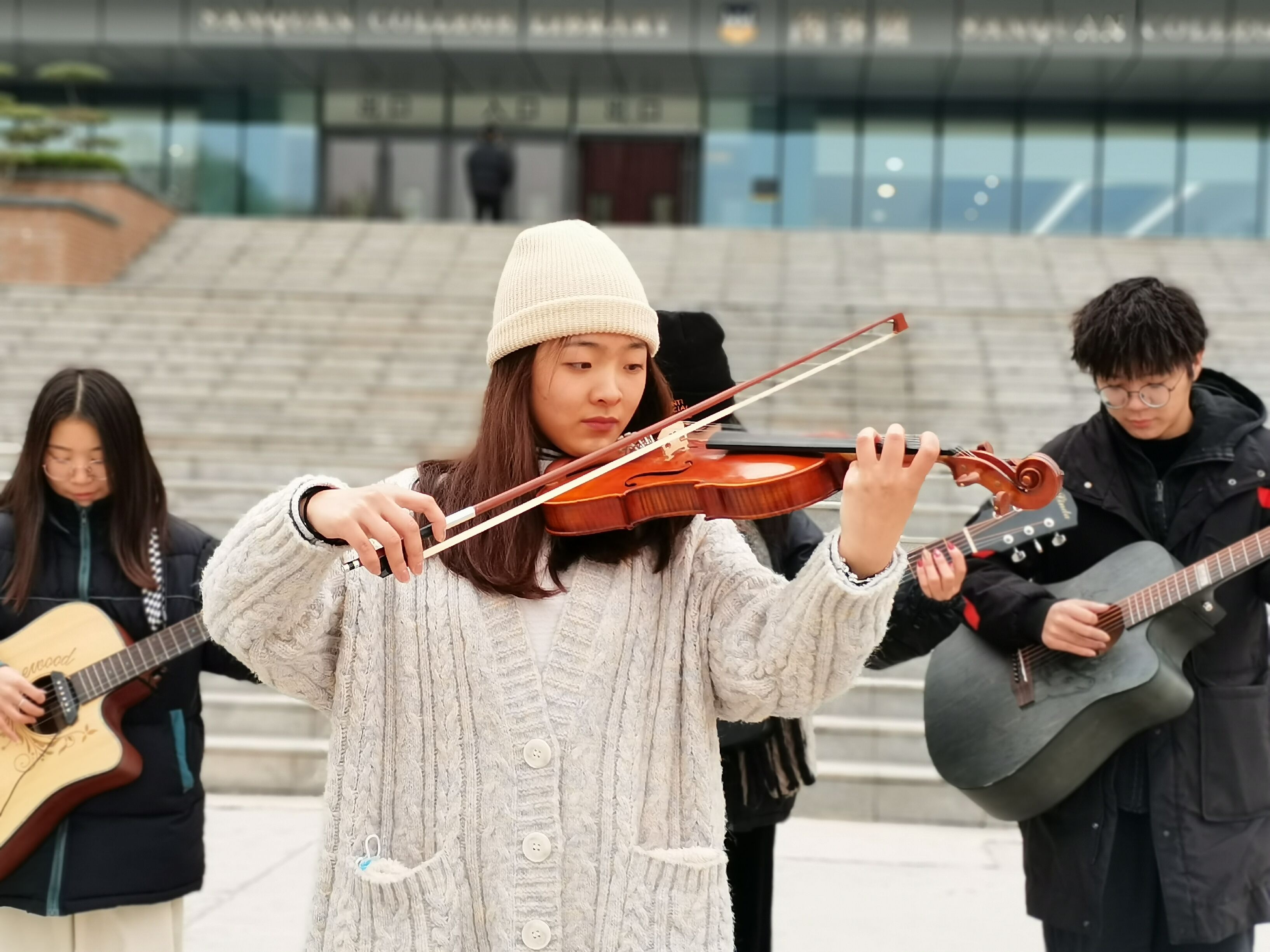 中午11点30分,正值师生用餐的高峰时期,校园内传来一阵动听的歌声,30余名学生演员瞬间脱去外衣,露出了身上的红色T恤,走上舞台,载歌载舞,演绎那首熟悉的歌曲《我的祖国》,美妙的歌声吸引众多学生围观。大家纷纷拿出手机拍照、录像,有的师生还挥舞着工作人员事先准备的小国旗,和演员们一起高唱爱国歌曲。同时,在学校的教室、图书馆、餐厅等各个地点,学生们通过歌曲演绎、诗歌朗诵、舞蹈表演等多种形式,纪念“一二·九”爱国运动。