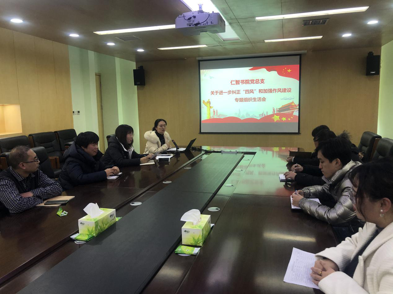 为深入贯彻落实《新乡医学院三全学院关于进一步纠正“四风”和加强作风建设专项治理工作方案》的要求,按照学校党委工作部署,12月19日下午,仁智书院党总支组织在行政楼第三会议室召开以进一步纠正“四风”和加强作风建设专题组织生活会,党总支书记马苏娟主持会议,全体教工党员参加会议。