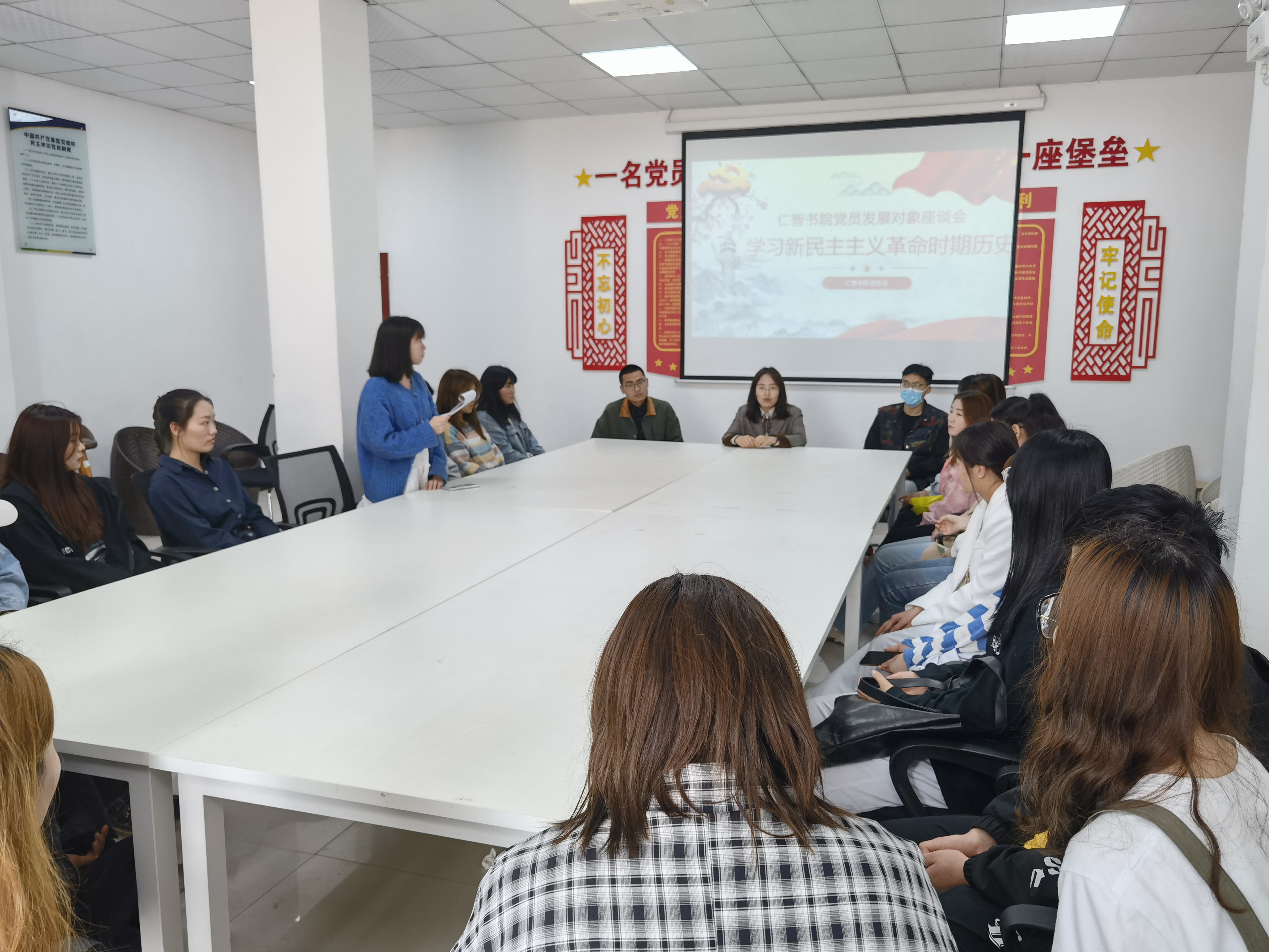 切实加强学校基层党组织建设,提升党员发展质量,2021年4月26日,仁智书院党总支开展2021年上半年党员发展对象座谈会,带领党员发展对象深入学习了新民主主义革命时期的历史并观看红色影片《决胜时刻》,与会同学积极参与讨论发表看法。