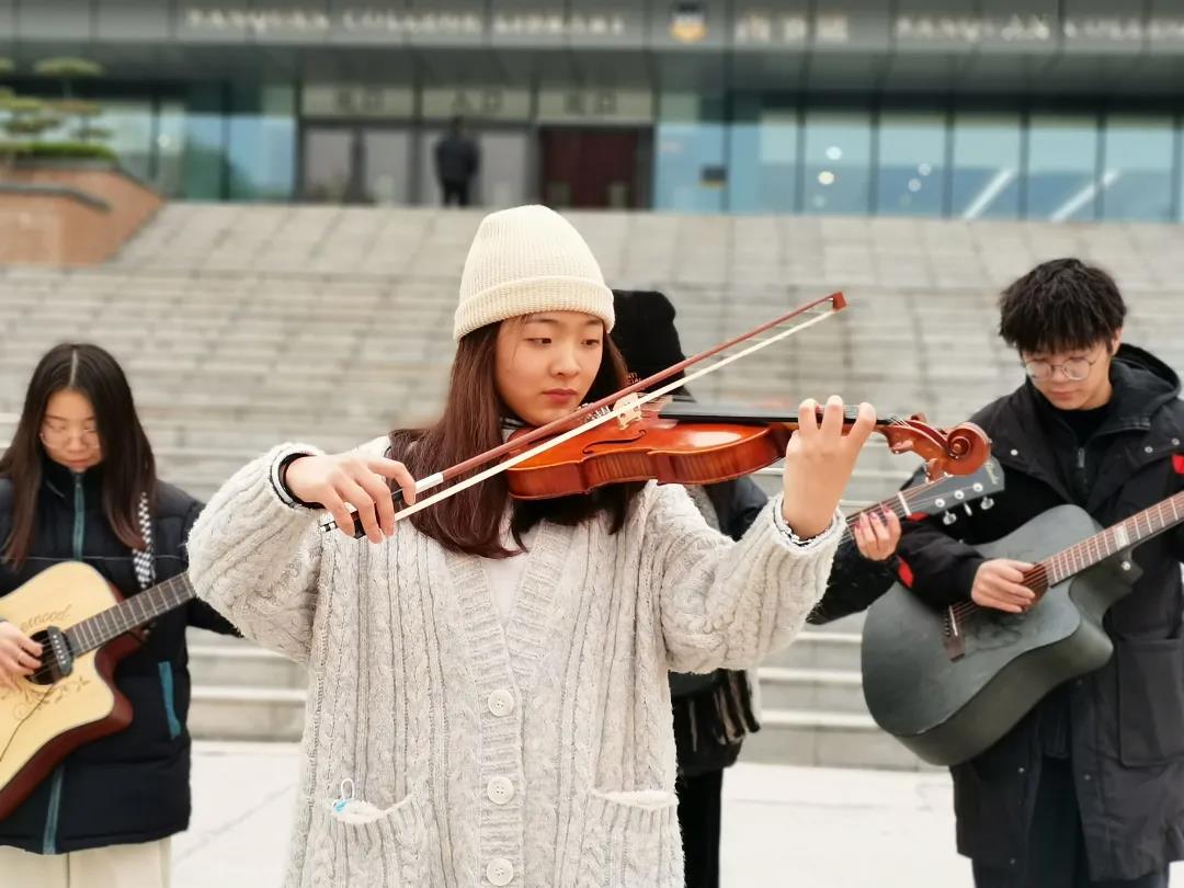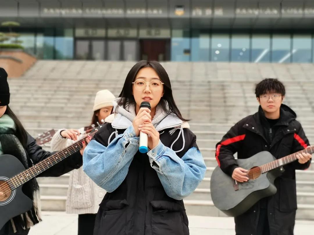 中午11点30分,正值师生用餐的高峰时期,校园内传来一阵动听的歌声,载歌载舞,演绎那首熟悉的歌曲《我的祖国》,美妙的歌声吸引众多学生围观。大家纷纷拿出手机拍照、录像,有的师生还挥舞着工作人员事先准备的小国旗,和演员们一起高唱爱国歌曲。同时,在学校的教室、图书馆、餐厅等各个地点,学生们通过歌曲演绎、诗歌朗诵、舞蹈表演等多种形式,纪念“一二·九”爱国运动。