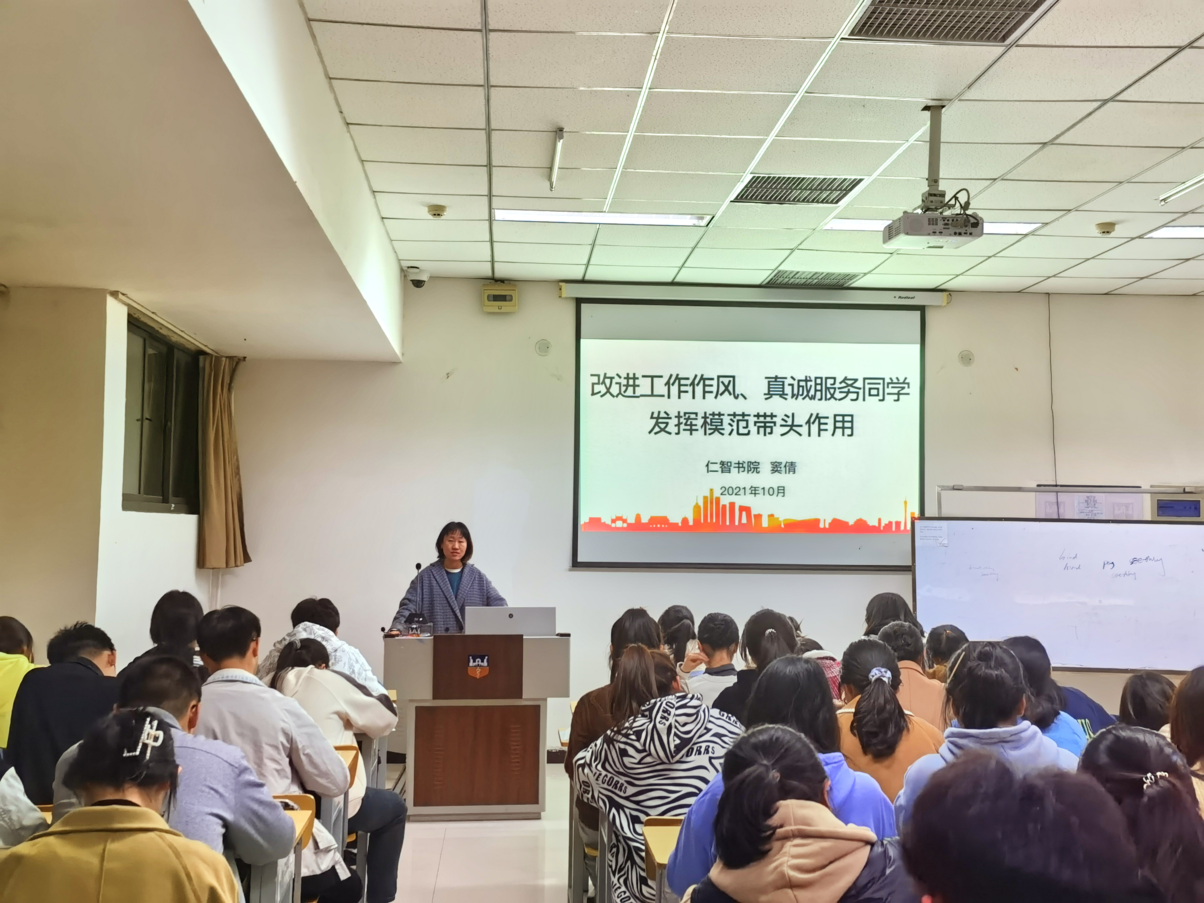为深入贯彻落实学联学生会改革各项举措,改进作风、恪守学生本分、牢记服务宗旨,积极畅通校园沟通协调渠道,实心实意帮助同学解决困难,发挥好学校联系学生的桥梁纽带作用。10月12日,新乡医学院三全学院仁智书院学生会于谨学楼C302教室召开改进作风服务同学精神学习会,仁智书院团总支书记窦倩老师为同学们进行了“七一”重要讲话精神及关于学联学生会工作人员改进作风服务同学的若干规定专题培训。