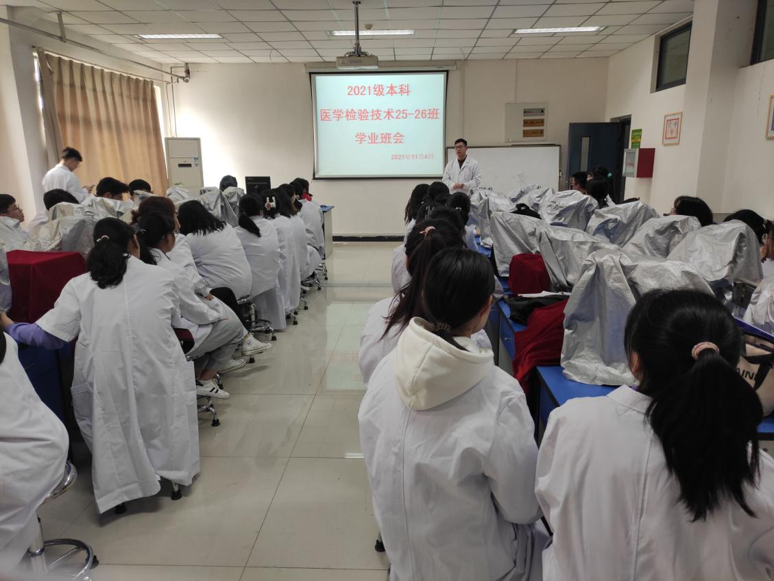 学生穿着庄严的医学生白大衣进入教室,医学检验李恒老师,先进行自我介绍,后对于医学检验的未末的职业规划做了四个方向,一一详细地做了解释和分析未末的就业形势。最后,李恒老师对于我们检验生考试情况和考研情况做了指导。