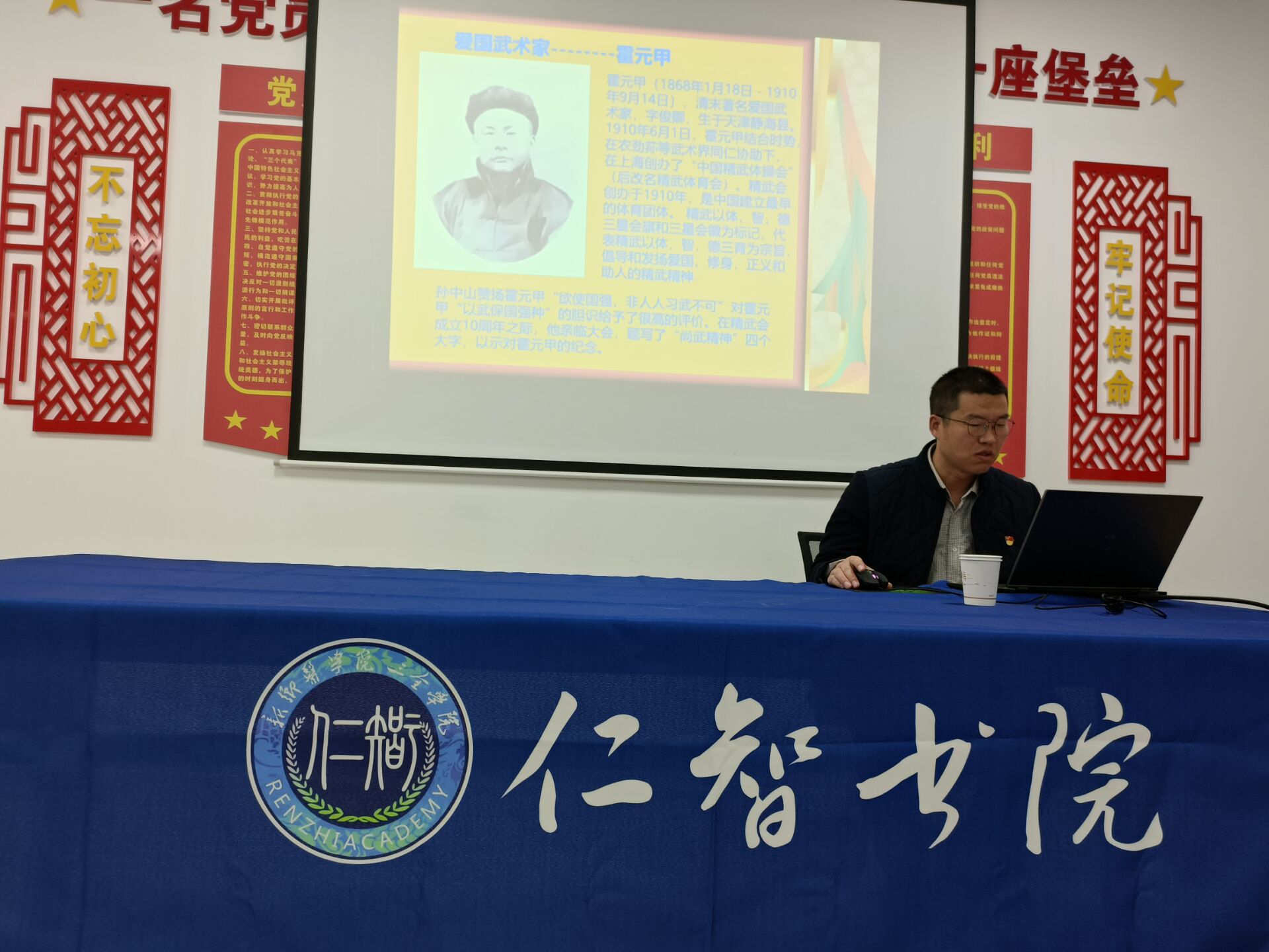 2021年11月17日晚,新乡医学院三全学院体育部直属党支部书记蒋广涛以《站立起来的中国人》为主题,在仁智书院党务办公室为仁智书院青马班同学与学生代表上了一堂生动的思政课。