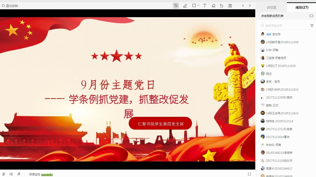 为深入贯彻习近平新时代中国特色社会主义思想,贯彻落实新时代党的建设总要求和新时代党的组织路线,推进党的组织工作科学化制度化规范化,提高党的组织工作质量,仁智书院学生第四党支部于9月23日在腾讯课堂开展了“学条例强党建,抓整改促发展”主题党日活动。