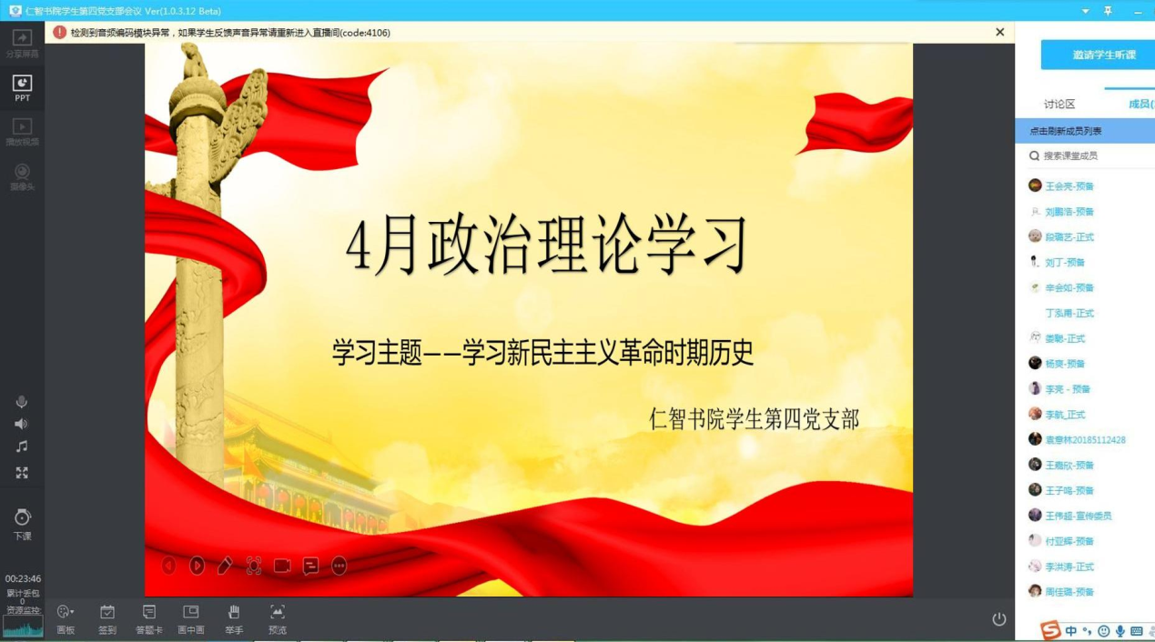 根据书院党总支的安排部署,结合支部实际,2021年4月26日仁智书院第四党支部开展4月份政治理论学习,以学习新民主主义革命时期历史为主题。