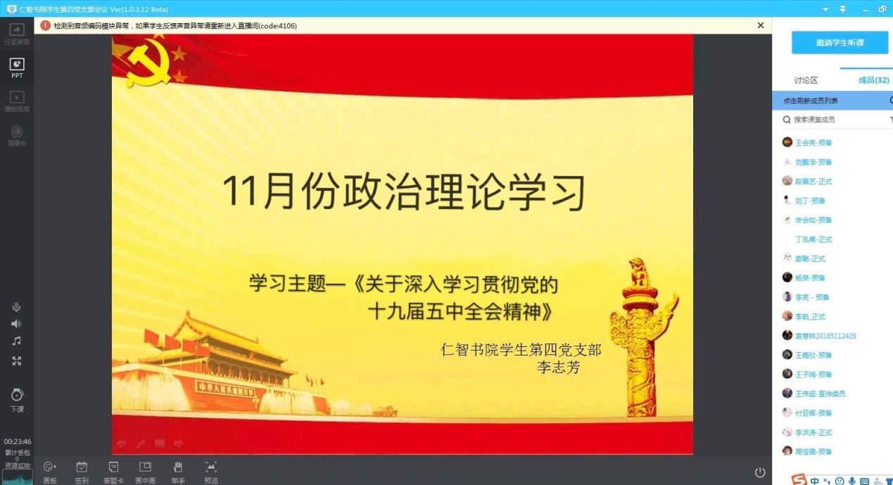 2020年11月9日,仁智书院学生第四党支部在腾讯课堂上开展了以《关于深入学习贯彻党的十九届五中全会精神》为主题的11月份政治理论学习。