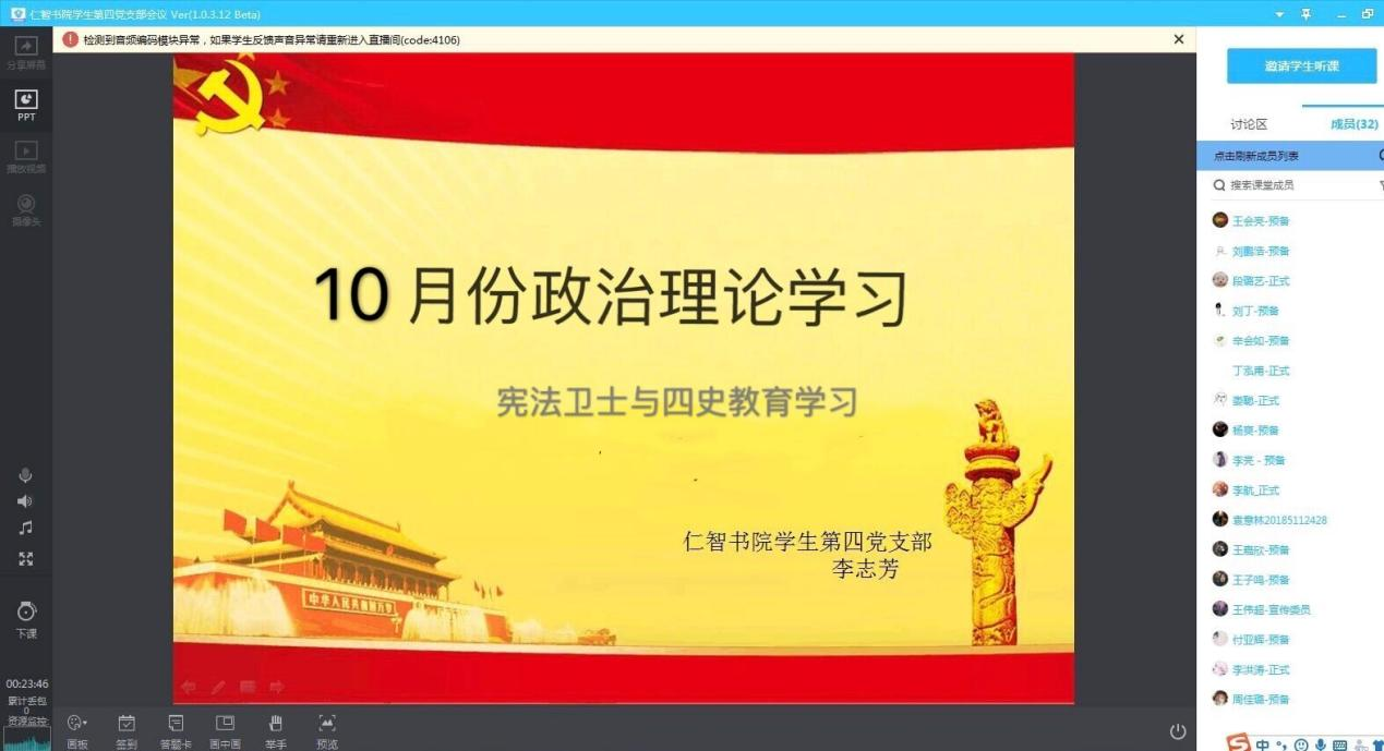 2020年10月16日,仁智书院学生第四党支部在腾讯课堂上进行了10月份政治理论学习,内容是“宪法卫士”与“四史”宣传教育学习。