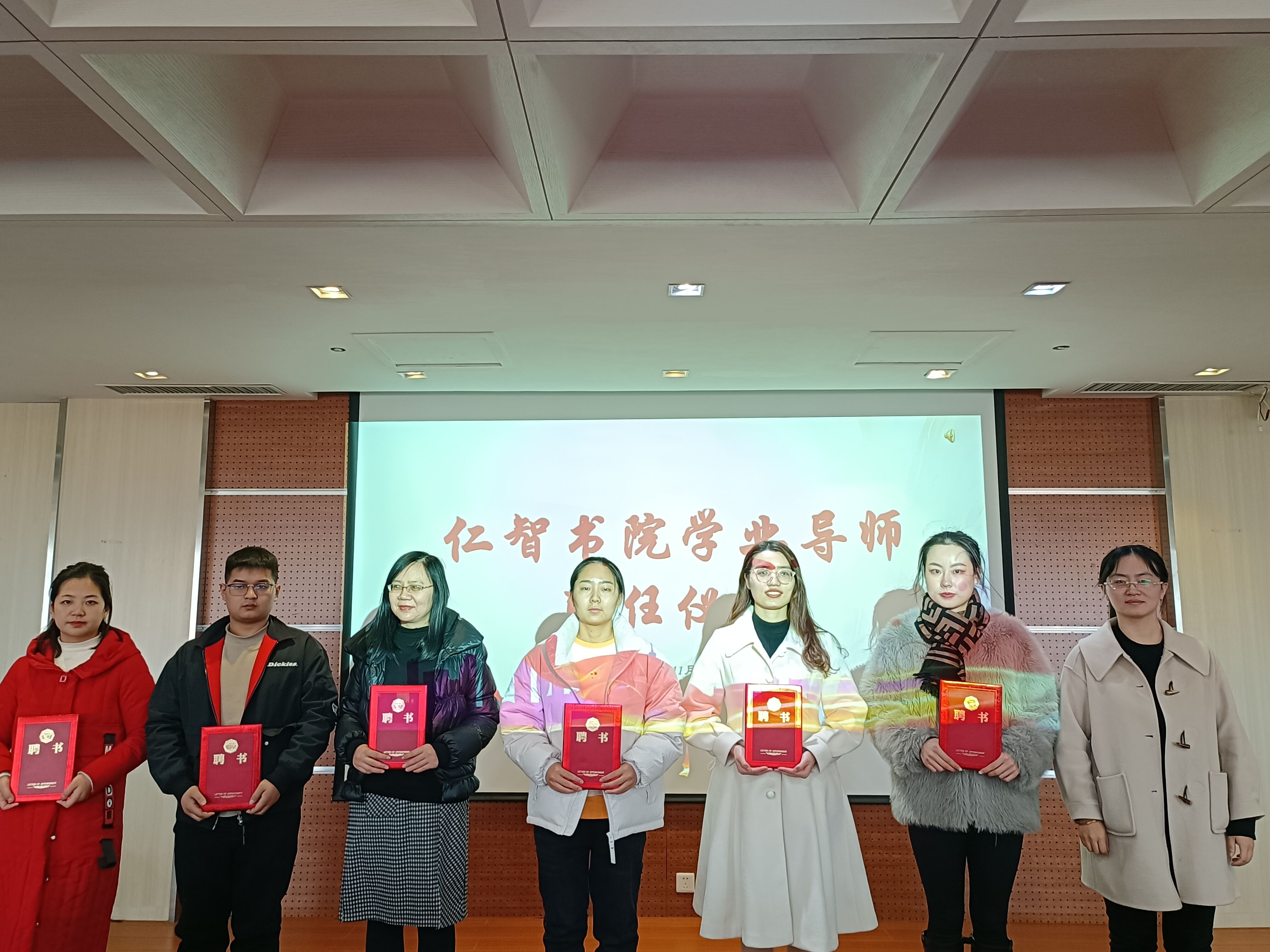 最后,主持人宣读此次我院聘任的学业导师名单,马苏娟为优秀学业导师代表孙颖、吴泽杰、吴玉娟、柴宁、温弘颁发聘任证书并合影留念。