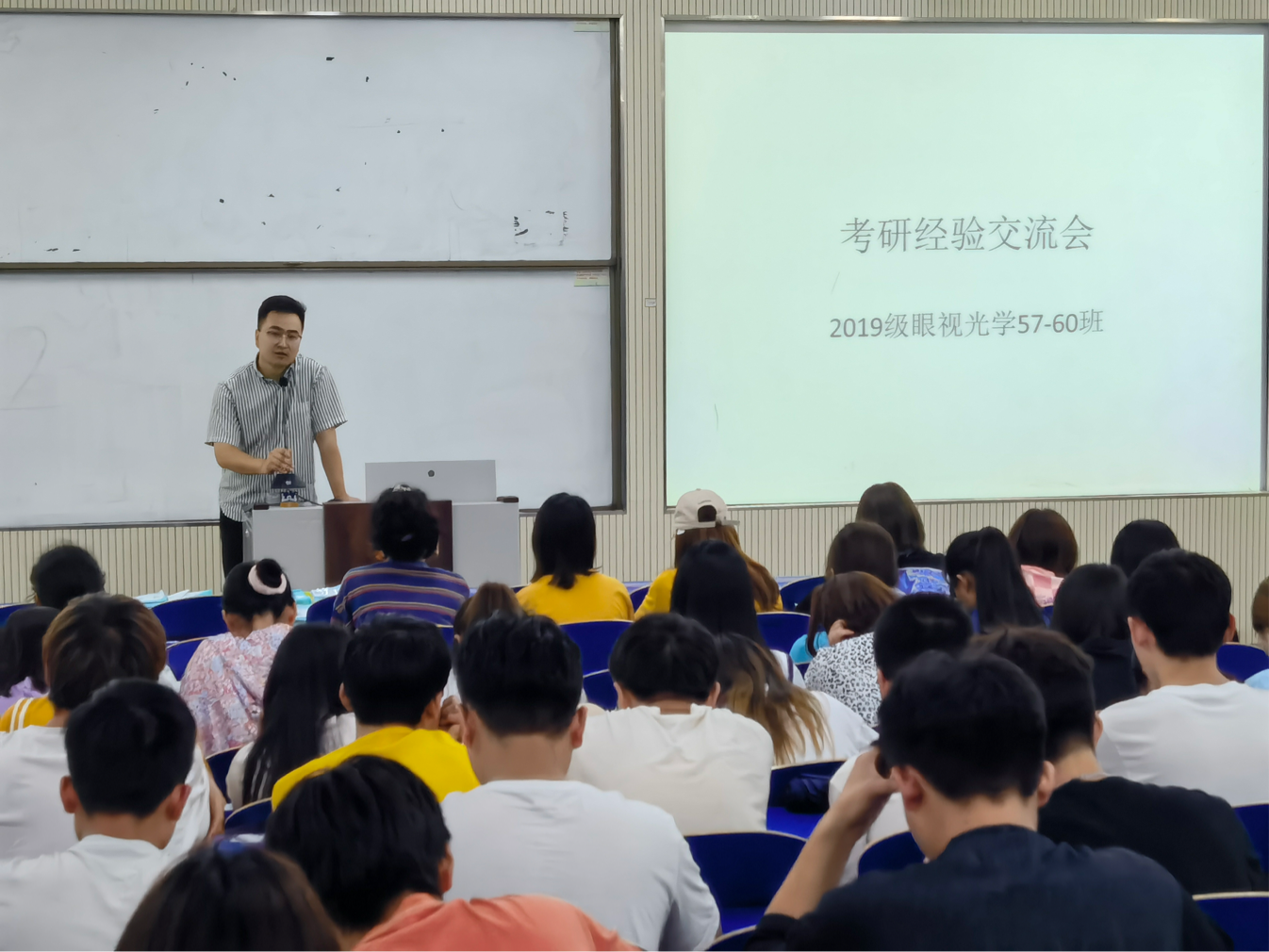首先进行分享的是现已被福建医科大学录取的17级眼视光学专业的学生赵鹏艳。她强调每位同学都应有自己的复习计划和复习节奏,要按照自己的规划进行复习,保持好复习心态,不要受外界因素的干扰。她从自身经历出发,从生活和学习的不同方面为大家提供了切实可行的建议。她认为,考研的成功等于正确的方法、不懈的努力、良好的心态以及恰当的复习材料。风趣的语言、清晰的条理和开门见山的风格,赢得了学生阵阵掌声。其次口腔医学技术、临床医学、英语三个专业也都进行了分享和交流,各个分享人分别结合自己的考研经历详细的给同学们讲解了读研的必要性和在备考期间应注意的问题,包括考研各科的复习方法、考研信心的树立、考研计划、备考心态的调整、生活饮食习惯、作息时间安排以及有关选择专业方向和复试等方面的一些心得,让同学明确了今后努力的方向。