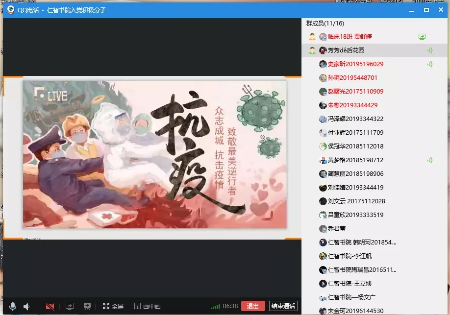 在“共抗疫情,爱国力行”的专题研讨会上,我们的10个活动小单元,打破了时间和空间的界限,发挥医学生的专业优势和个人特长,用微视频、诗歌朗诵、书法绘画、告白书信、重温誓词等多种形式,讴歌了在疫情过程中那些舍身忘我、勇敢逆行的人们,展示了在疫情面前我们中华民族伟大的精神。通过专题研讨会,学生们分享感人事迹、感动画面和先进思想,表达了广大入党积极分子爱国爱党之情,以及对抗疫工作者的崇高敬意。