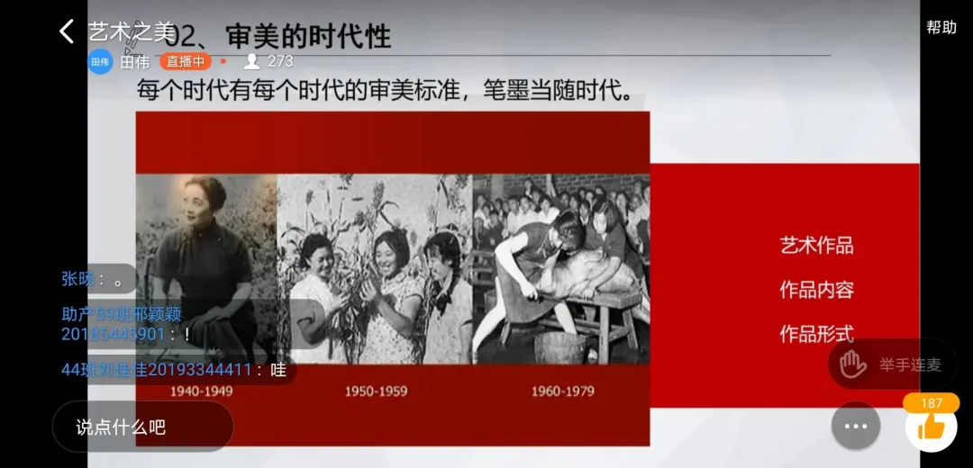 在讲座上,田伟老师通过审美的时代性,艺术与美学的比例尺度,节奏韵律性和统一性等多方面对绘画作品进行了美学讲解和艺术的深度理解,从艺术家的视角和研究者的角度,为大家展示了当代艺术和抽象绘画的欣赏途径,为学生们带来了一场精彩的艺术分享。同时,田伟老师还从不同的角度,进一步讲解了在抗疫期间的绘画作品的艺术价值,引起了学生的强烈共鸣。他说,艺术不仅是为了创作作品,在世界各国被新冠疫情笼罩时,更迫切地需要艺术家们将正确的道德观念、真实的人情冷暖付诸表现,为人们灌注团结奋进的精神能量。
