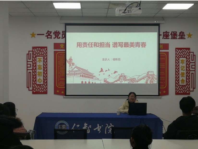 11月21日晚,新乡医学院三全学院护理学院党总支副书记杨昕岳以“用责任和担当 谱写最美青春”为主题,向仁智书院青马班学生讲授思政课。