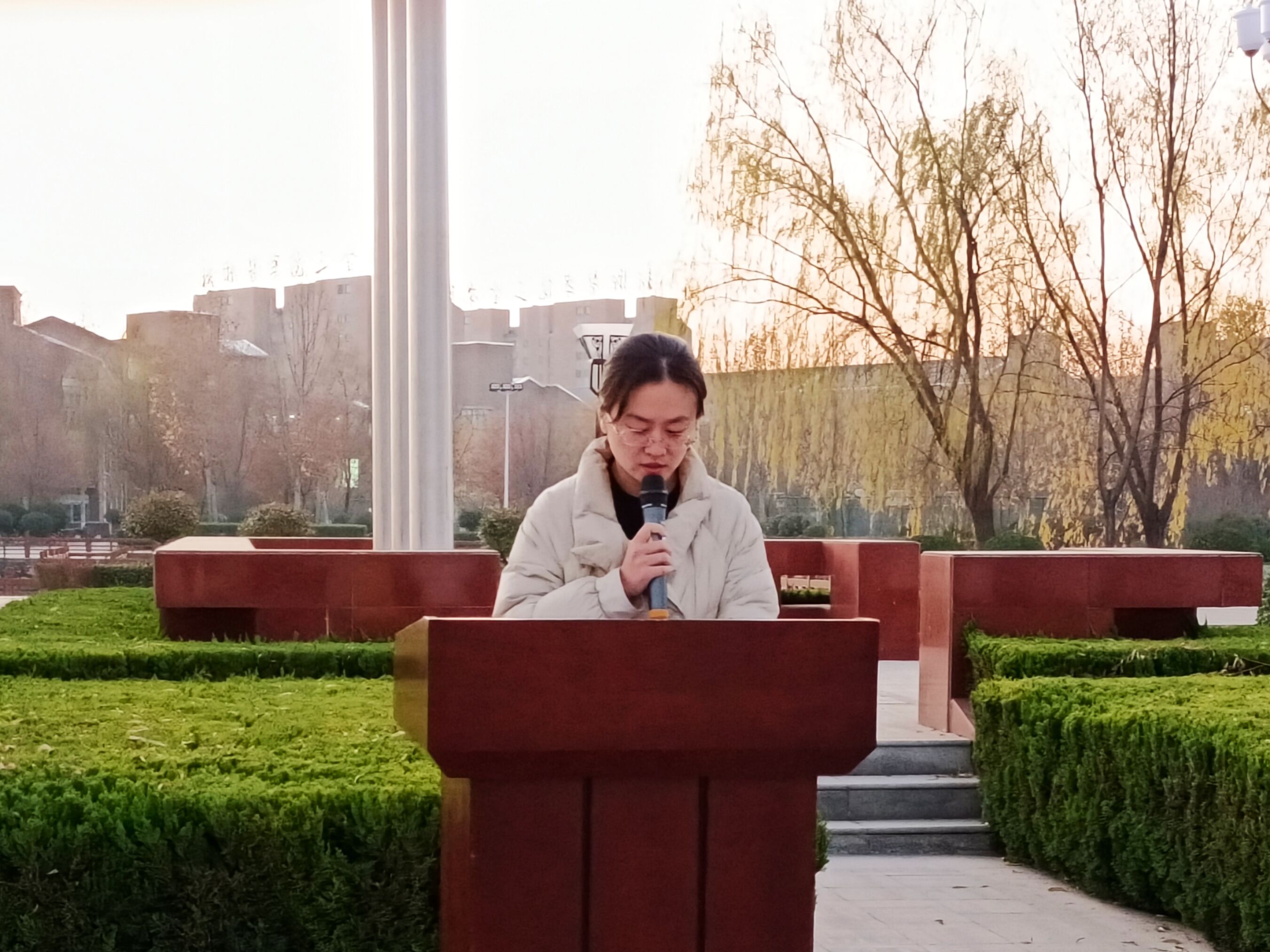 学生代表史家昕以《一二九运动旗帜永远飘扬》为题目进行国旗下的演讲,“青年者,国家之魂”,国家的前途和命运离不开青年的前途和命运,没有青年的牺牲和奋斗精神,就没有整个民族素质的提高,他表示作为青年学生要有一颗赤诚的爱国之心,坚定理想信念,为祖国和人民奉献自己的一生。
