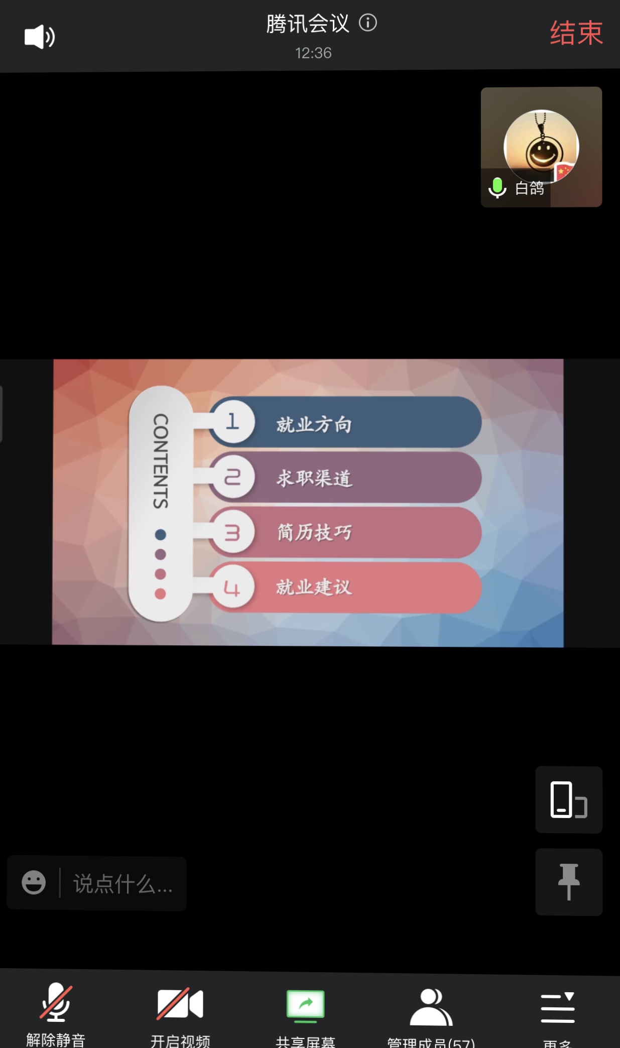 会议伊始,白鸽老师从就业方向、求职渠道、简历技巧和就业建议四个方面进行分享。她鼓励即将毕业同学树立求职信心,多渠道搜集就业信息,结合自身情况精准定位职业目标。接着,赵鹏艳结合自身考研经验对考前复习和相关注意事项等内容进行分享。她建议考研同学考前要适当进行调整,希望考研的各位学生能够百尺竿头更进一步,最终实现自己的考研梦想。随后李筱萌结合自身工作经验与大家进行分享,她建议大家积累扎实专业基础知识,其次重视实习机会,最后珍惜在校美好时光。