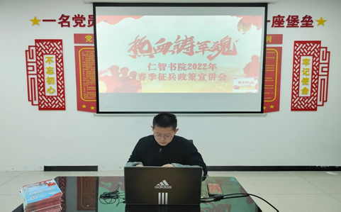 为响应国家号召,鼓励学生积极参与应征入伍,推动国防和军队现代化,仁智书院于12月21日下午在党员活动室举行了“2022年春季征兵政策宣讲会”,会议由仁智书院王鹏飞主持,我校征兵办公室负责人周开放和杨志涛主讲,仁智书院学生参与。