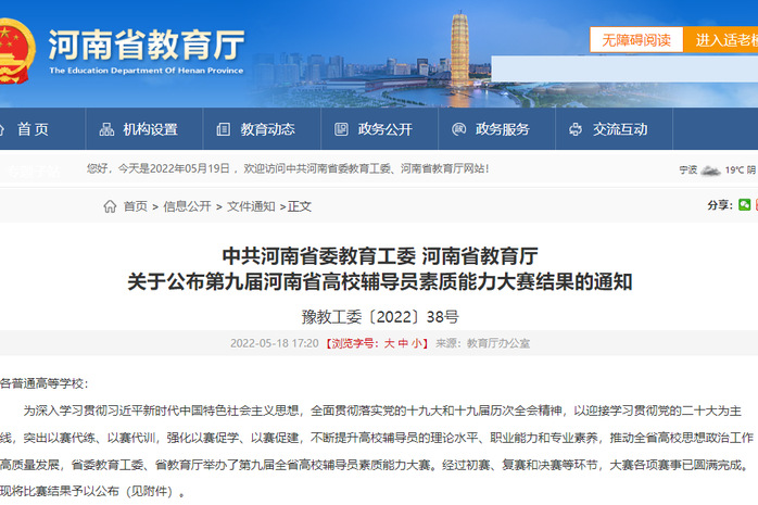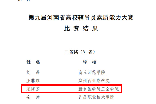 为不断提升高校辅导员的理论水平、职业能力和专业素养,推动河南省高校思想政治工作高质量发展,突出以赛代练、以赛代训,强化以赛促学、以赛促建,按照《中共河南省委教育工委办公室河南省教育厅办公室关于举办第九届全省高校辅导员素质能力大赛的通知》的要求,经过初赛、复赛和决赛三个环节,我校仁智书院宋海芳荣获河南省第九届高校辅导员素质能力大赛二等奖。