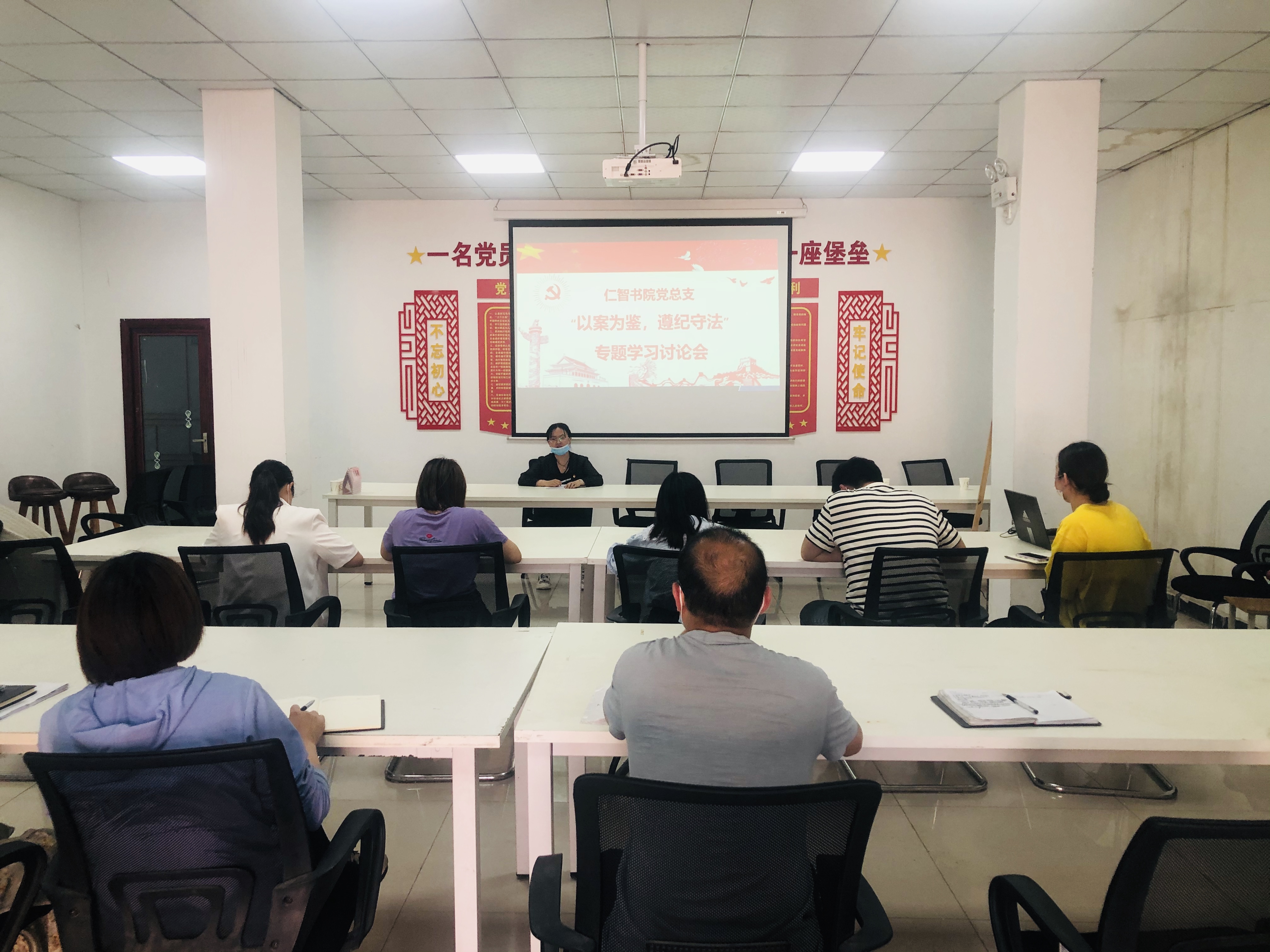 根据中共新乡医学院三全学院纪律检查委员会《新乡医学院三全学院“以案为鉴、遵纪守法”警示教育活动实施方案》的通知精神,为引导全体职工进一步增强遵守党规党纪和国家法律法规意识,不断推进纪律教育常态化、制度化,6月10日下午,仁智书院党总支在党员活动室召开“遵纪守法、廉洁从业”专题学习讨论会。仁智书院党总支书记马苏娟主持会议,全体教职工参加会议。
