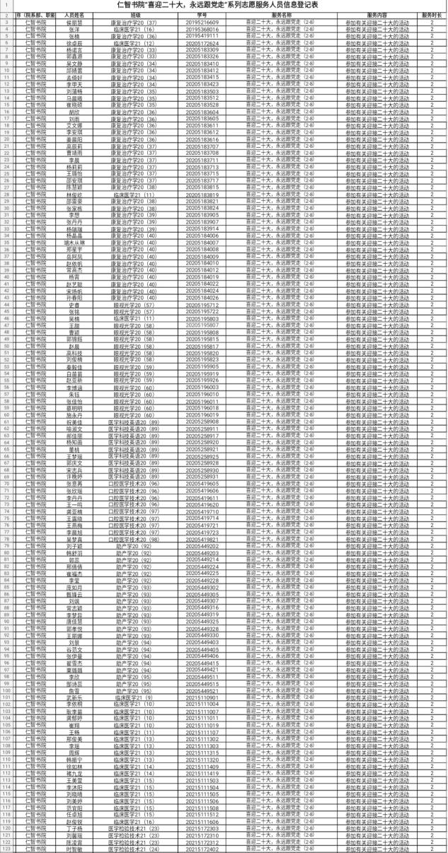为了庆祝中国共产党成立101周年,喜迎党的二十大,激励学生传承红色精神,切实增进大学生们的爱国爱党情感,缅怀党的光辉历程,追寻党的历史足迹,知党史、感恩党、听党话、跟党走。仁智书院青年志愿者联合会特此对“喜迎二十大,永远跟党走”系列志愿服务进行名单公示: