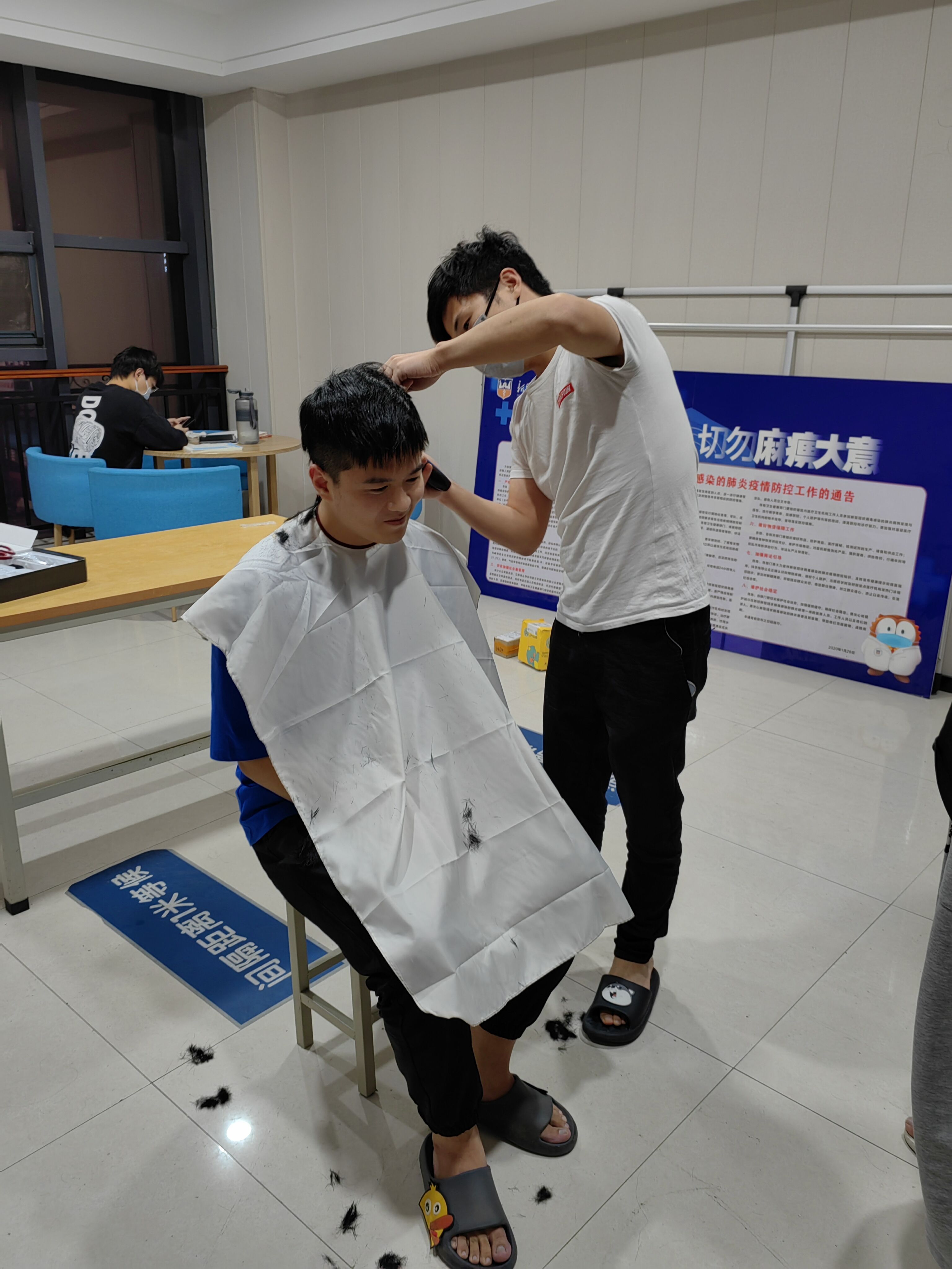 由于此次封校时间已长达近一月有余,许多学生提出了由于封校无法理发的需求,郑州第七人民医院教学校区的陈浩老师积极与医院协调沟通,动员学生。这时,仁智书院2018级临床医学实习生李群挺身而出,表示自己之前在朋友处学习过理发,可以帮助同学们解决燃眉之急。一张椅子、一把剪刀、一个推子、一条围布、一个吹风机,一个流动美发室就“上线”了。只见李群“理发师”娴熟的拿着电推和剪刀,认真为大家修剪着发型,同学们也对李群同学的理发服务非常满意。“李群,你剪这发型真不赖啊!”“来来来,李同学,这再来一剪子的......!”李群说道“发挥个人特长,助力疫情防控,我感到非常荣幸。虽然忙完之后有的时候会累得腰酸、手抖,可看到同学们满意的笑容,感觉一切都是值得的。”李群同学这一义务理发之举也给处于封校的学生们带来了很多欢乐与温情。