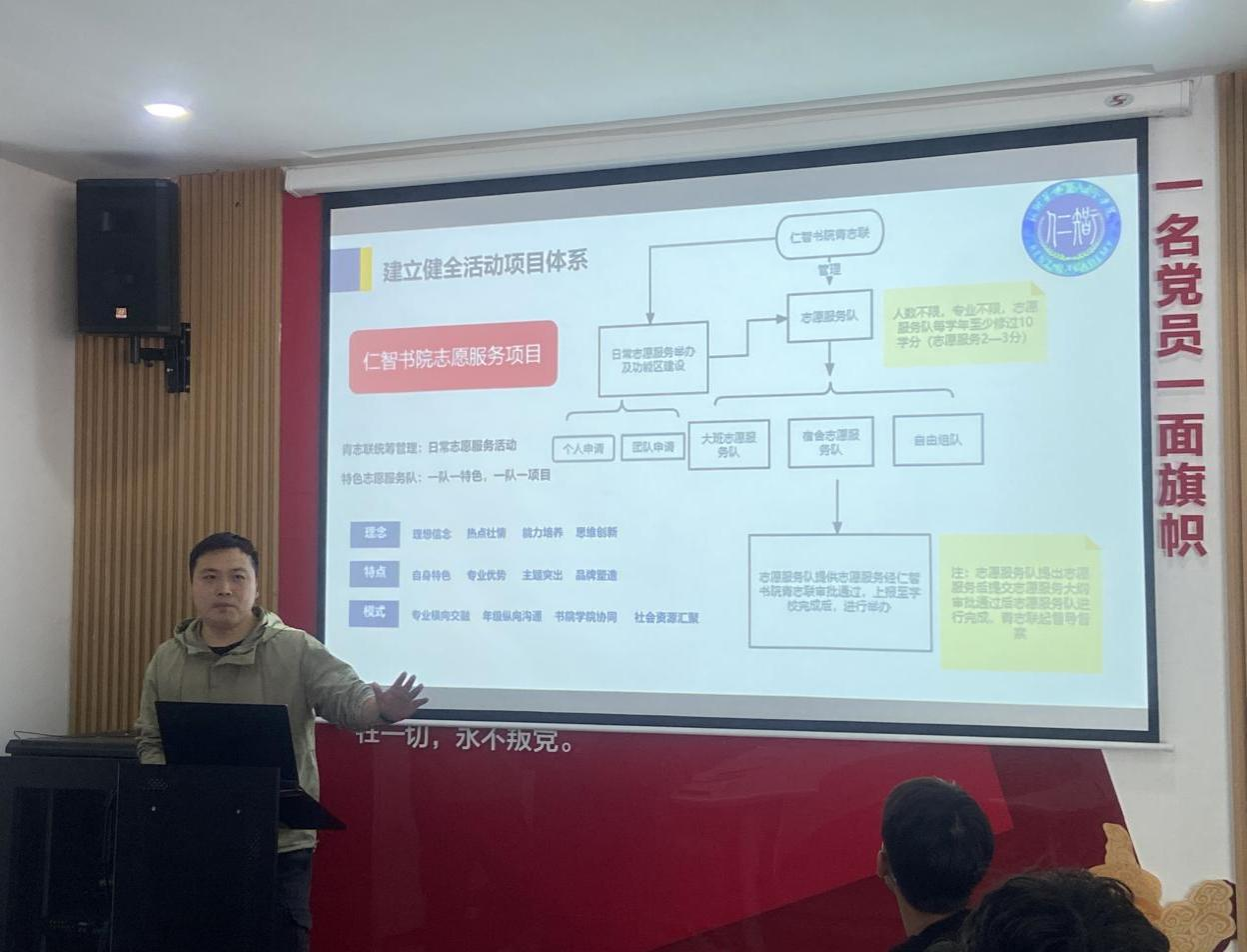 会议伊始,朱洋洋老师听取了仁智书院各学生组织的工作汇报,并对学生代表反馈的各类问题进行梳理解答。朱老师肯定了同学们心系书院、积极建言献策的主人翁精神,要求各学生组织要切实发挥好桥梁纽带作用,既要第一时间把同学们的诉求和意见建议反映给书院,也要将书院的相关政策规定和工作举措及时传达给同学们,形成良性互动,让书院的服务工作更接近学生的实际需求,使同学们更加理解支持学院的各项管理要求,切实提升同学的满意度和获得感。此外,朱老师对仁智书院志愿服务活动改革进行详细地讲解,强调开展志愿服务活动要形式多样化、丰富化、生活化,从学生需求出发,从学生喜闻乐见的活动形式出发,不断提升学生活力,增强班级凝聚力。同时朱老师对同学们学习知识、养成锐意进取和乐观向上的生活态度、为实现人生价值不断夯实个人能力提出了殷切期盼。