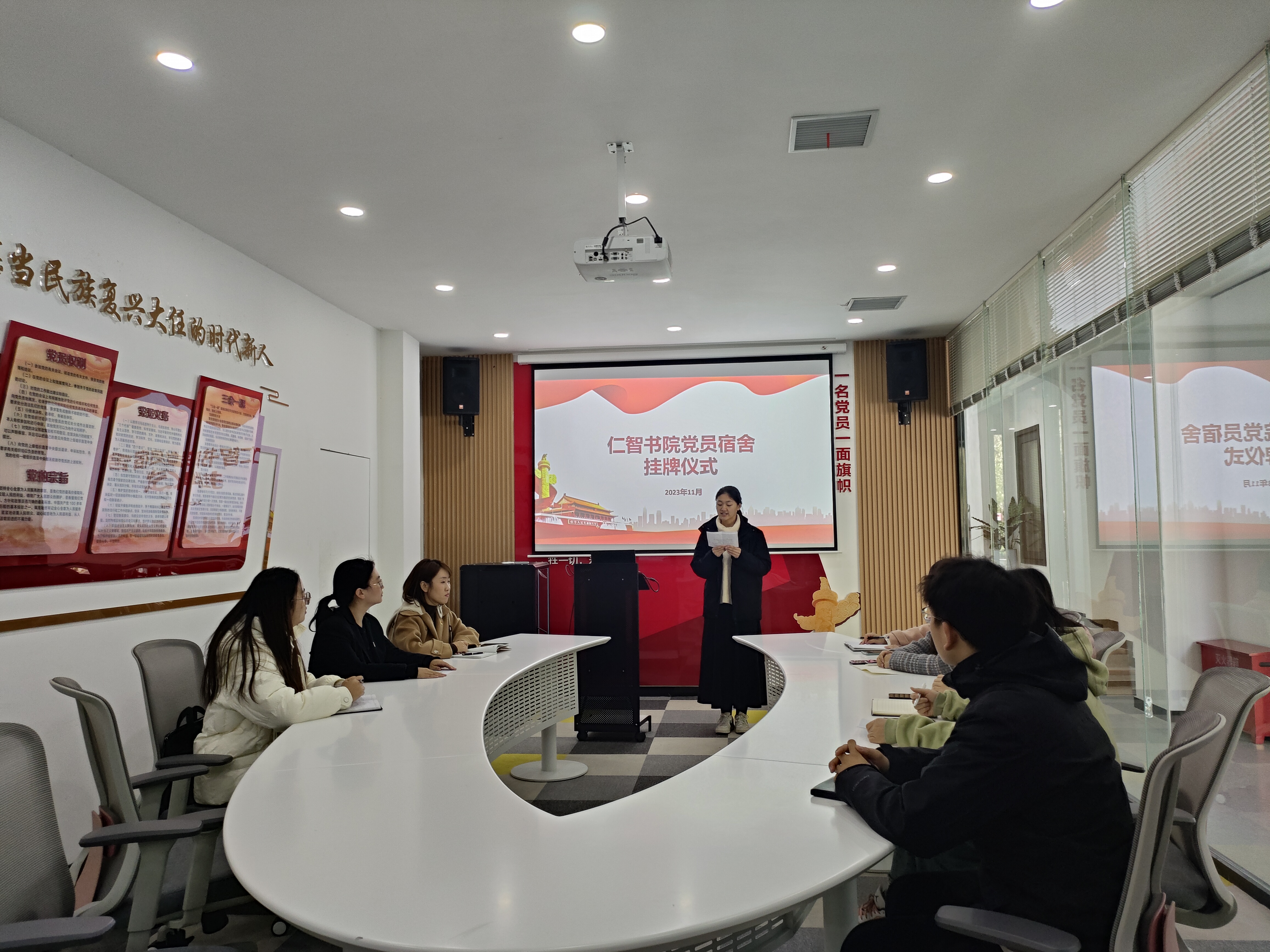 为了让学生党员铭记党员身份,提高党员服务意识,培养党员奉献精神,充分发挥学生党员在宿舍文明建设中的先锋模范作用,仁智书院于11月16日举办学生党员宿舍挂牌启动仪式。仪式上,仁智书院与会领导和老师向党员宿舍进行挂牌,仁智书院党总支书记马苏娟对被授予“党员宿舍”的学生表示热烈祝贺,指出要努力做到“一名党员带动一个宿舍,一个宿舍带动一层宿舍,一层宿舍带动一个学生整体”,带动、帮助同学们共建和谐、友爱、安全、文明宿舍。