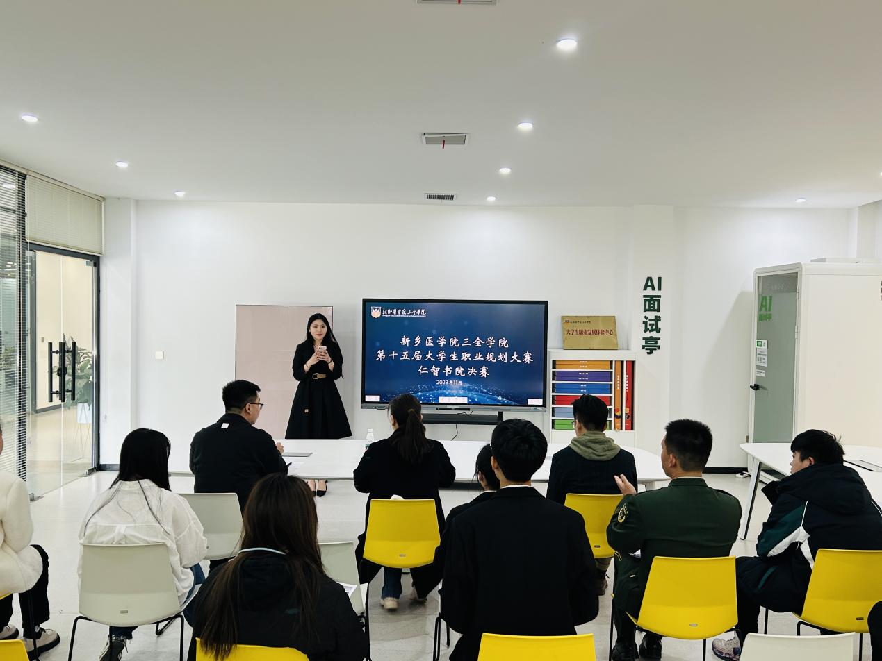 为进一步推进大学生职业生涯规划,加强就业指导和大学生职业规划意识,培养大学生对职业的正确认知,科学合理规划学业与职业发展,提升就业竞争力,11月22日中午,仁智书院在职业体验中心和学习支持中心举行了大学生职业规划大赛书院决赛,口腔技术学院副院长张紫阳、学务部办公室主任桂冉、仁智书院院务主任窦倩、口腔技术学院行政秘书陈梦雨、光明眼科学院教师陈波和仁智书院就业专干安云朋担任本次比赛评委。