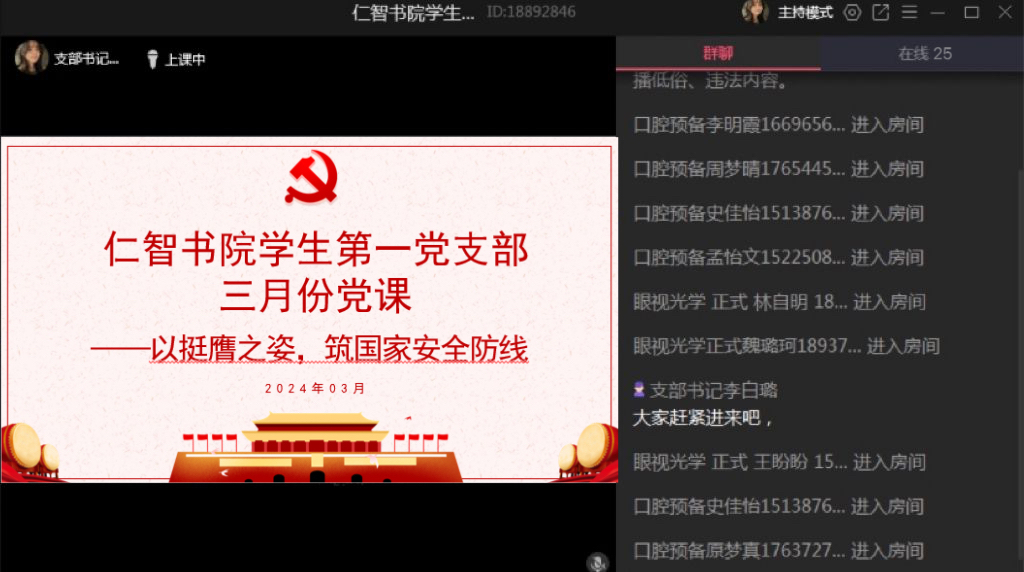 今年是总体国家安全观提出10周年,活动主题是“总体国家安全观·创新引领10周年”。2024年3月19日,学生第一党支部开展“以挺膺之姿,筑国家安全防线”主题党课。此次党课由党支部书记李白璐主讲,党支部全体成员参加。