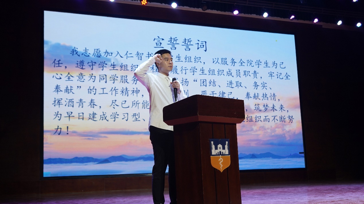 紧接着,学生干部聘任仪式正式开始。仁智书院党总支书记马苏娟、团总支书记窦倩和各组织指导老师分别为学生组织主席团、学生会、青年志愿者联合会、社团联合会、自我管理委员会、大学生艺术团和团副训练营组织干部颁发聘书。