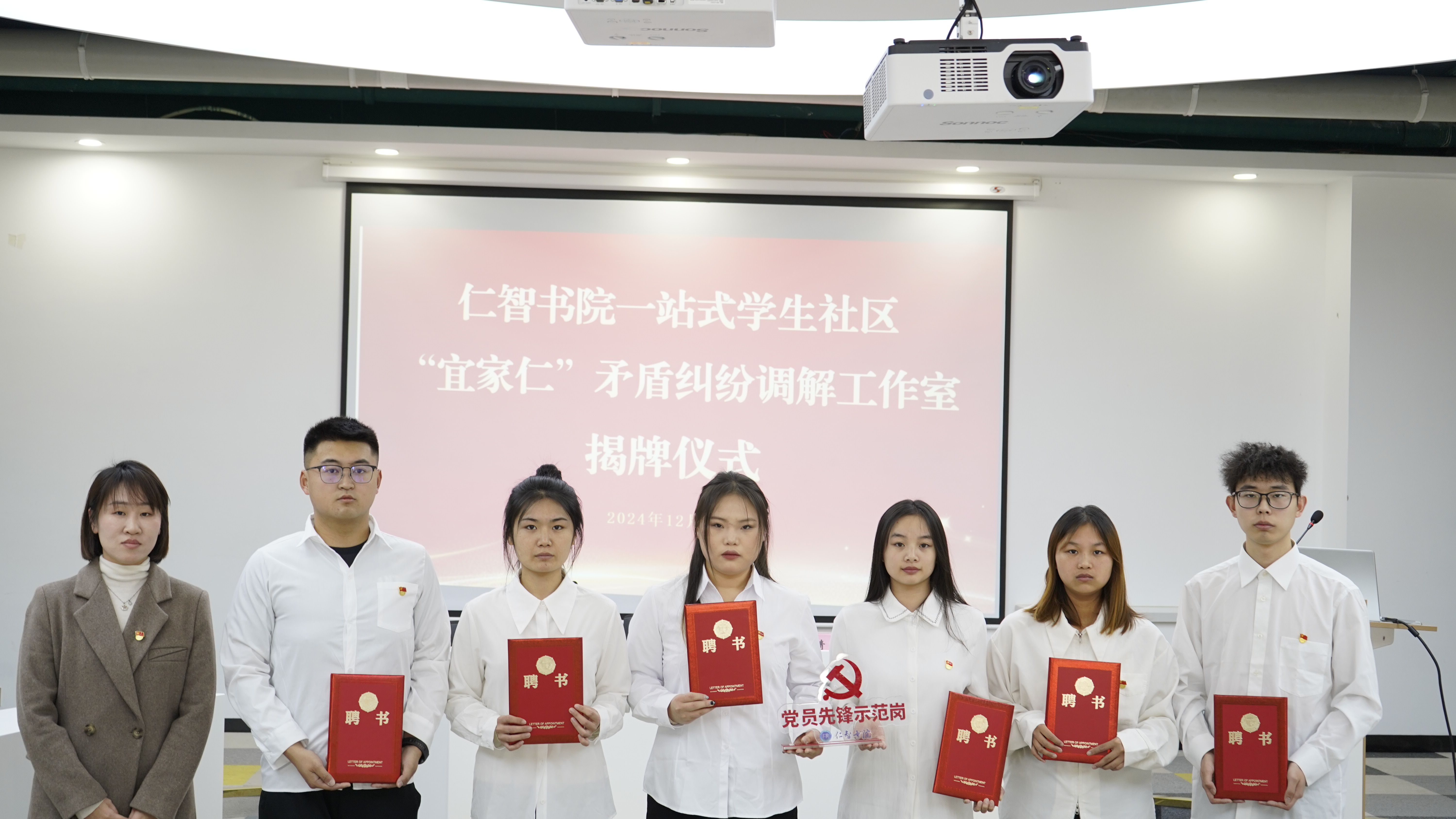 随后,揭牌仪式正式开始。马苏娟为“宜家仁”矛盾纠纷调解工作室揭牌,并向该工作室教师顾问代表王绍瑜颁发了聘书。同时,窦倩为工作室的学生党员代表王紫慧、王海菲、刘浩龙、袁津津、陆沛松、高承坤颁发了聘书及党员先锋岗牌,并向学生调解员代表魏梦展、史兰欣、张倩、高雅授予了胸牌。